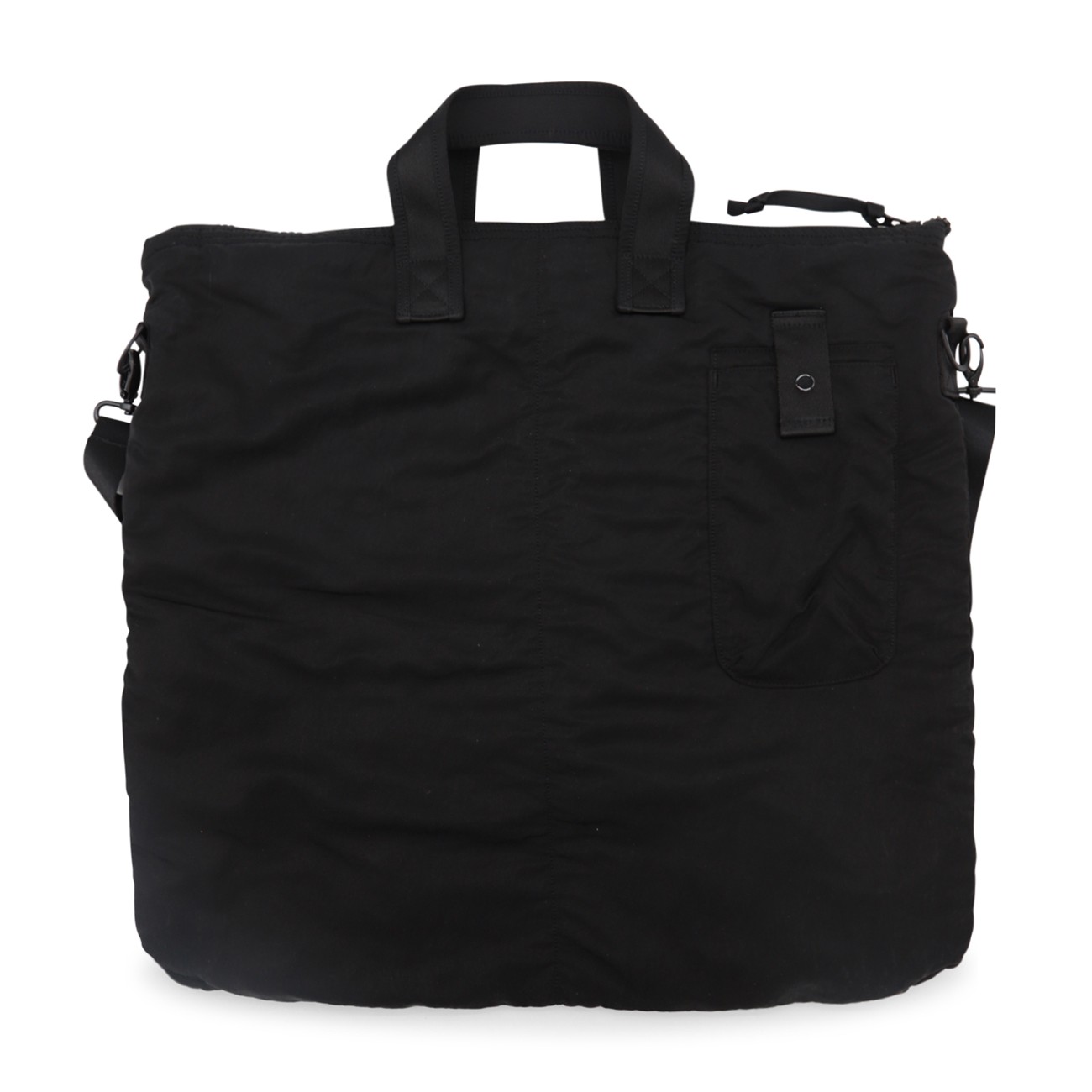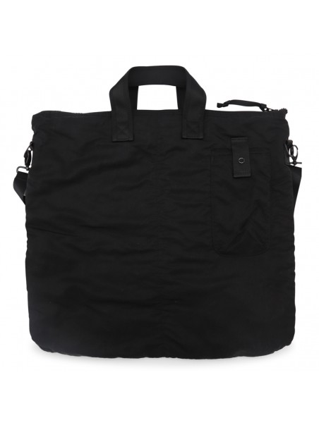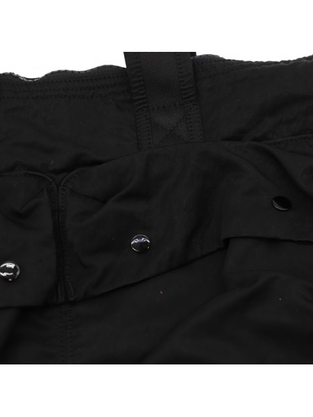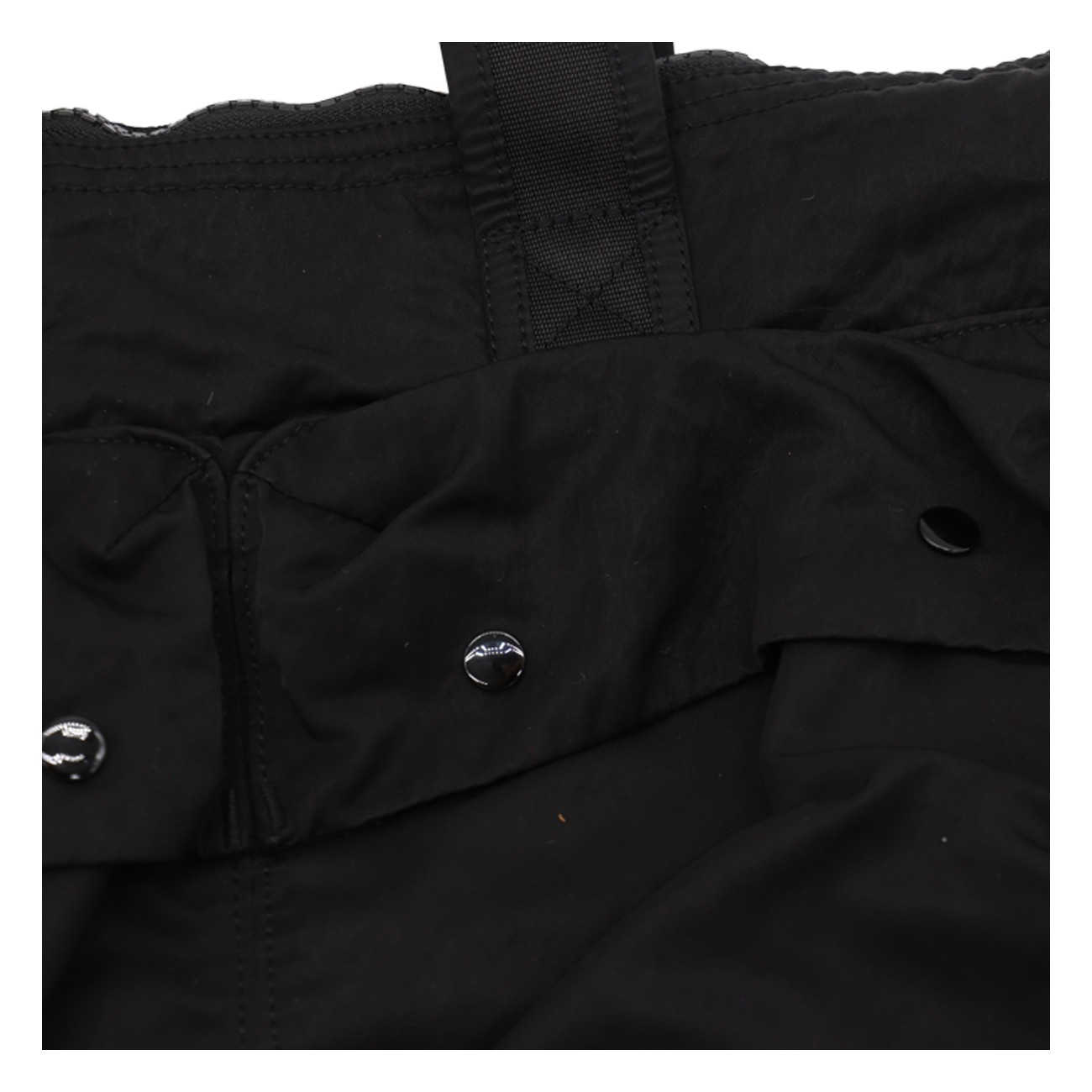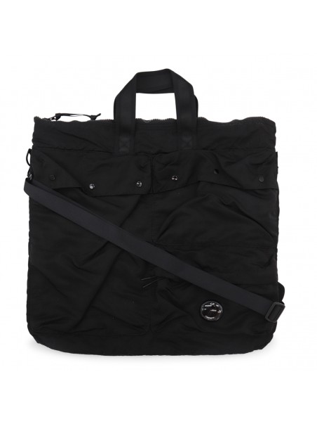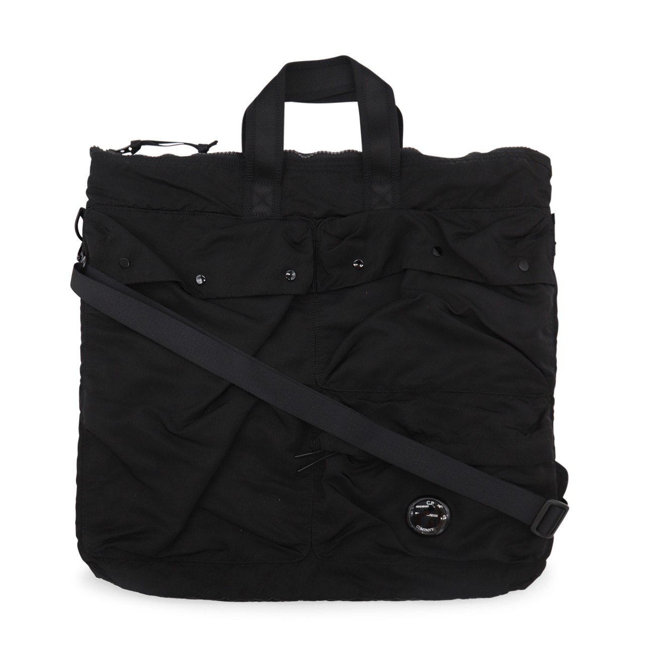 Black tote from CP Company featuring top handles, main compartment, removable adjustable strap and pockets.