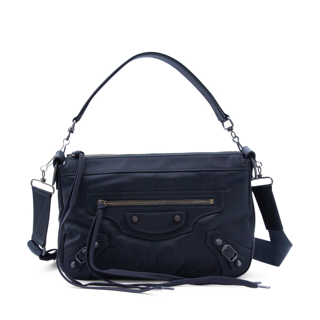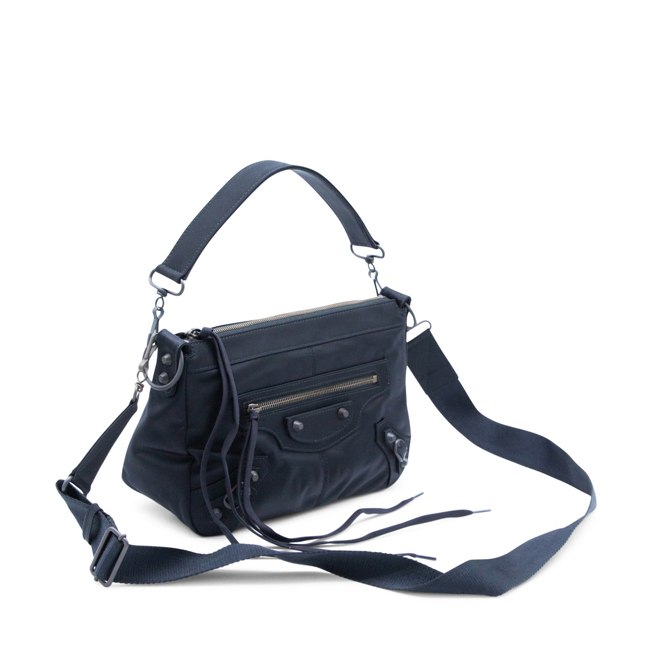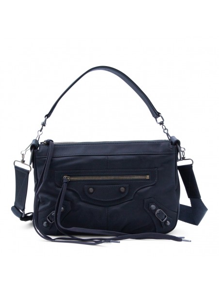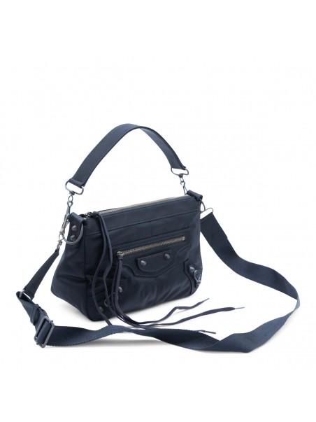 Black shoulder bag from Balenciaga featuring top handle, adjustable and removable strap, tone on tone hardware, drawstring detail and pockets.