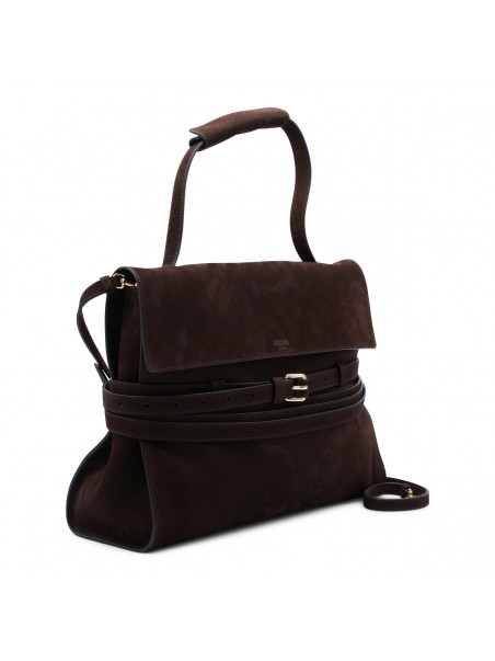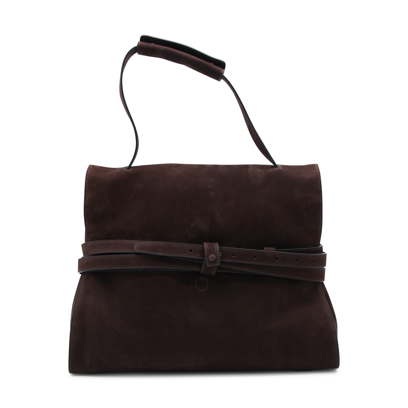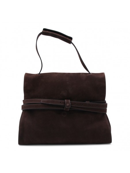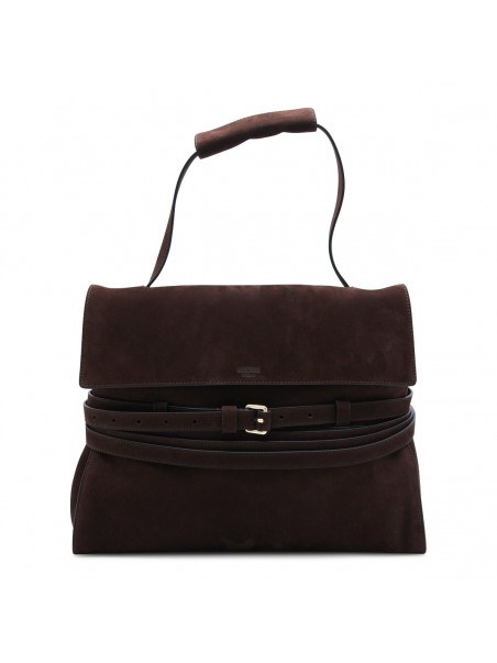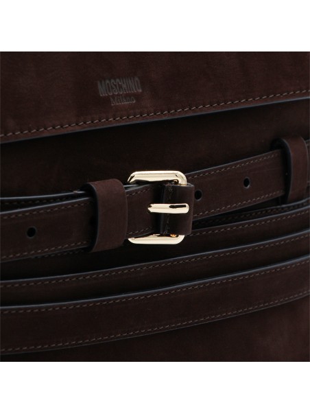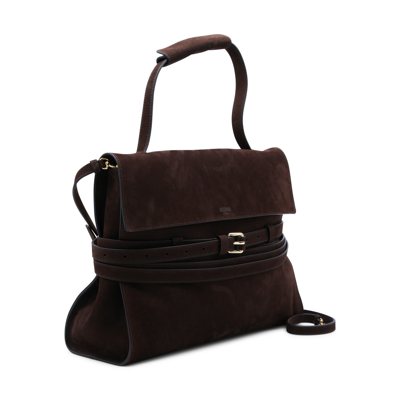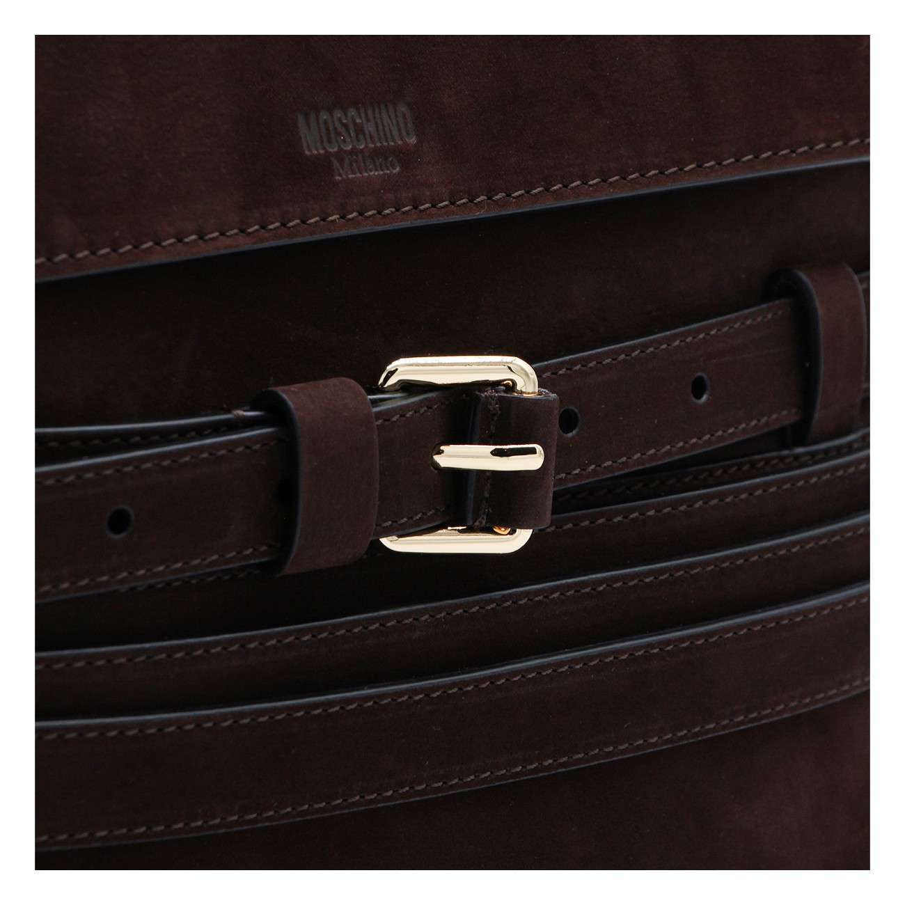 Brown leather top handle bag from Moschino featuring frontal logo, inside pocket and gold tone hardware.
