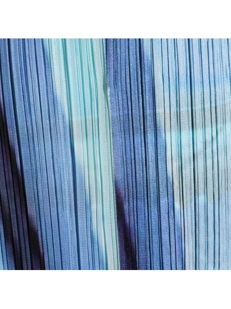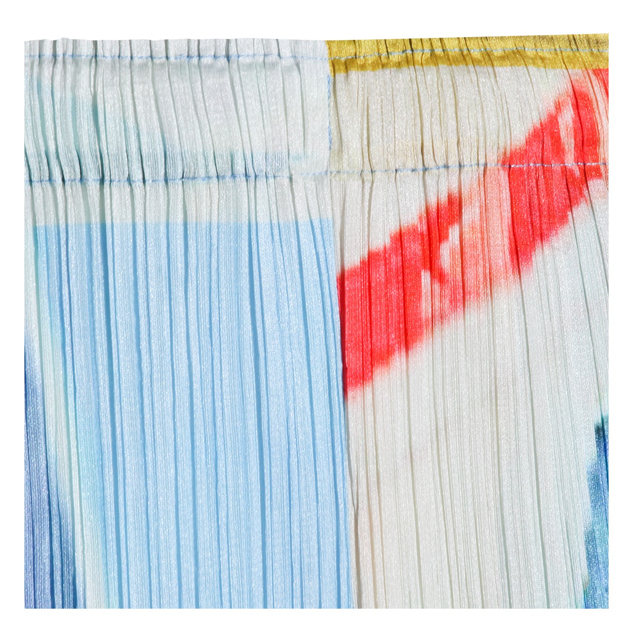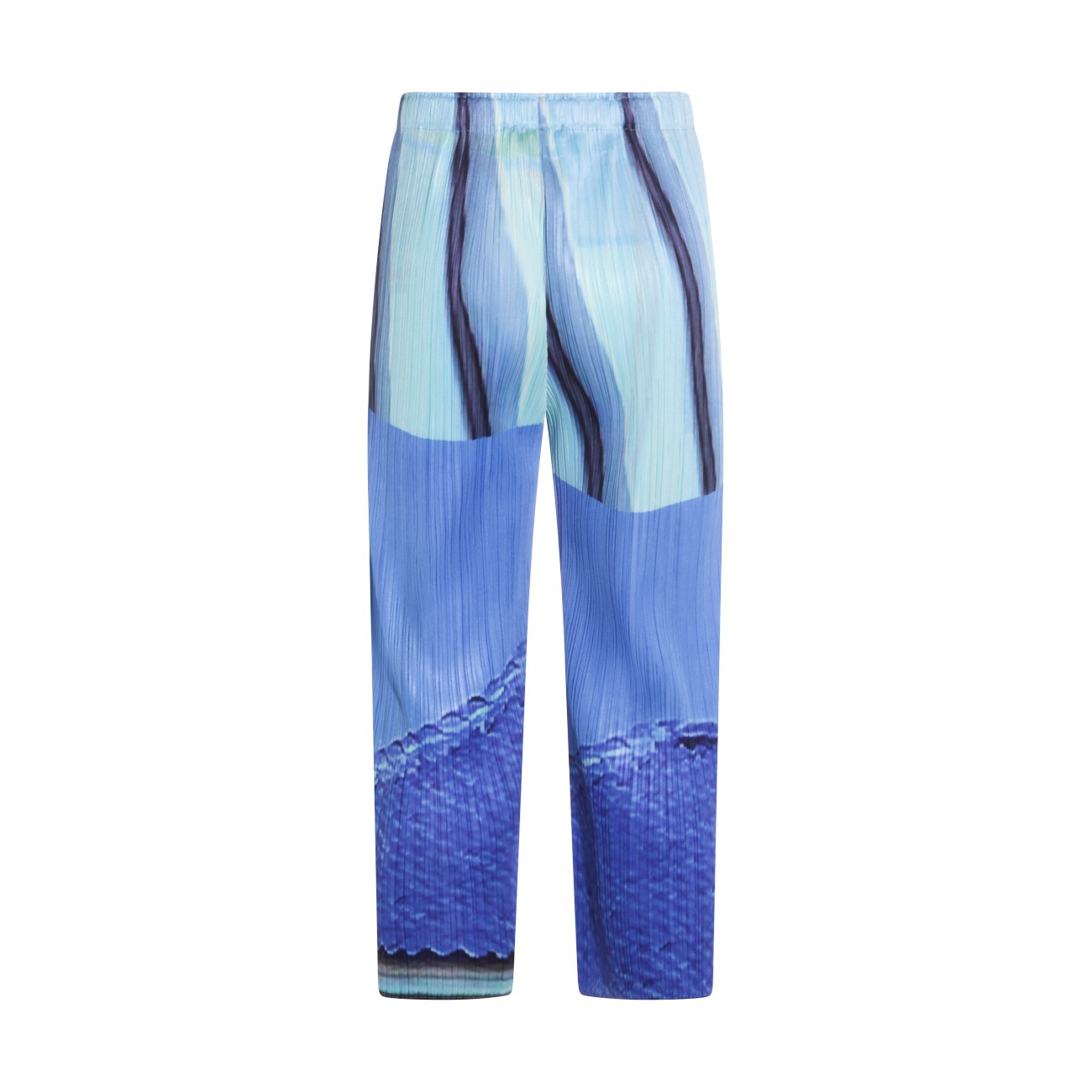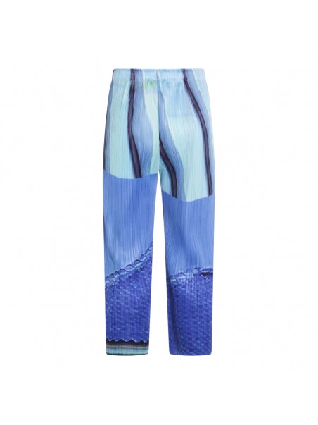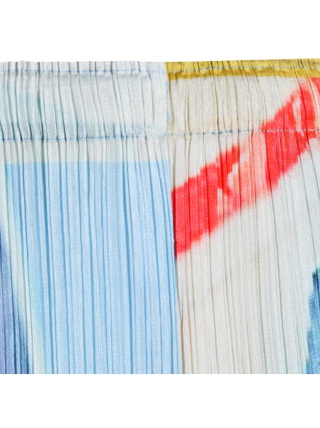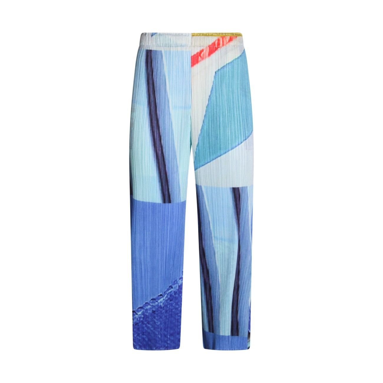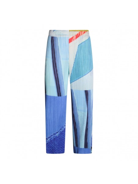 Blue and yellow pleated pant from Pleats Please Issey Miyake featuring elasticated waist, details, long length and comfortable fit.