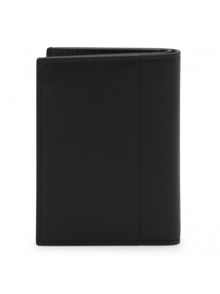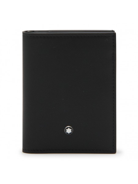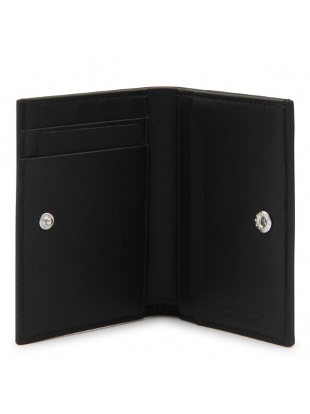 Black leather card holder from Montblanc featuring frontal logo patch and inside card slots.