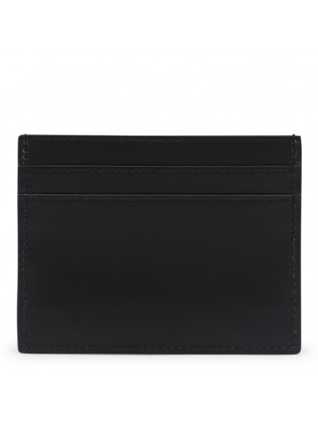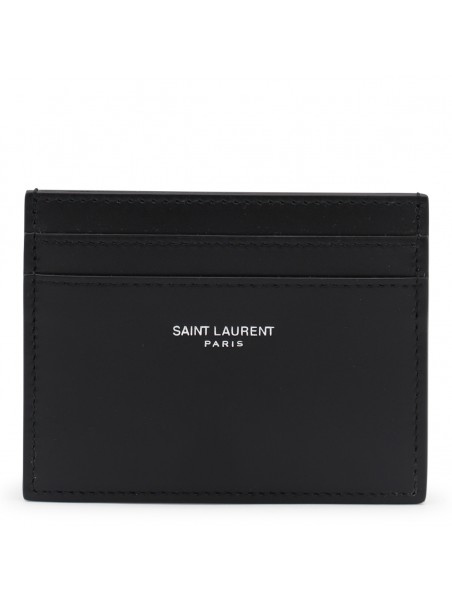Black leather card holder from Saint Laurent featuring card slots and frontal logo.
