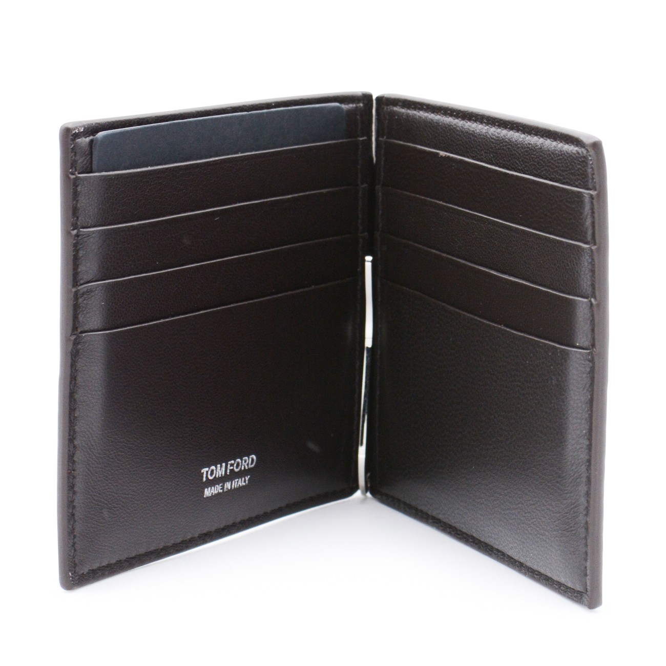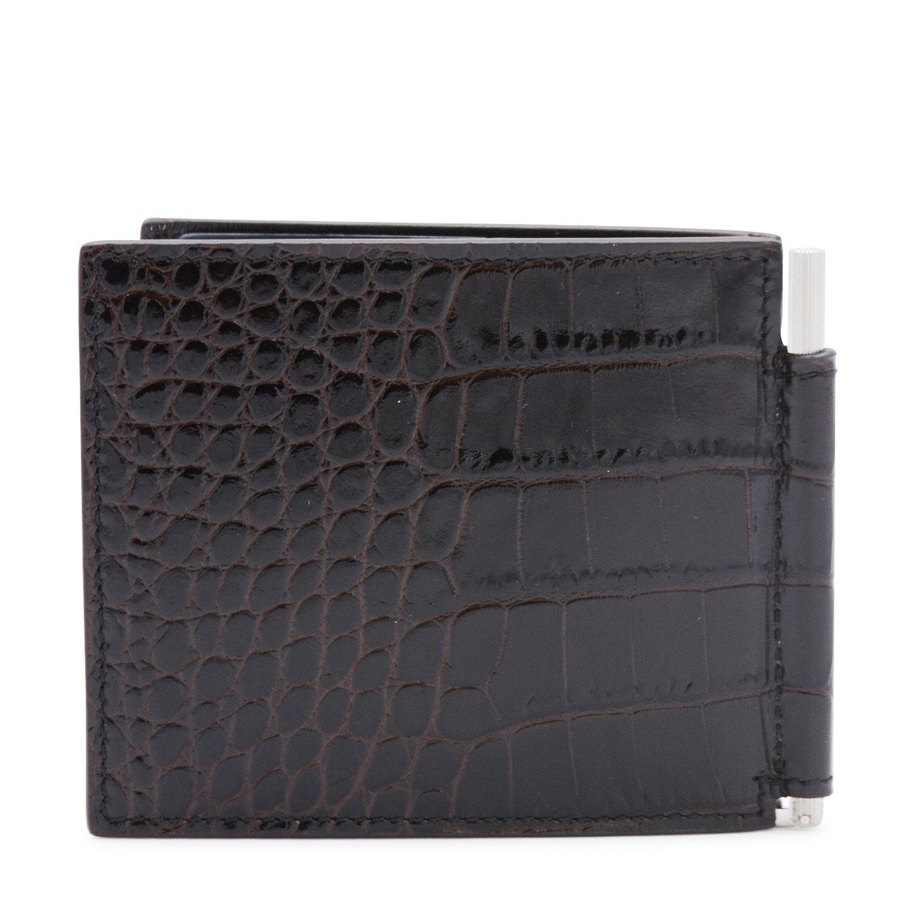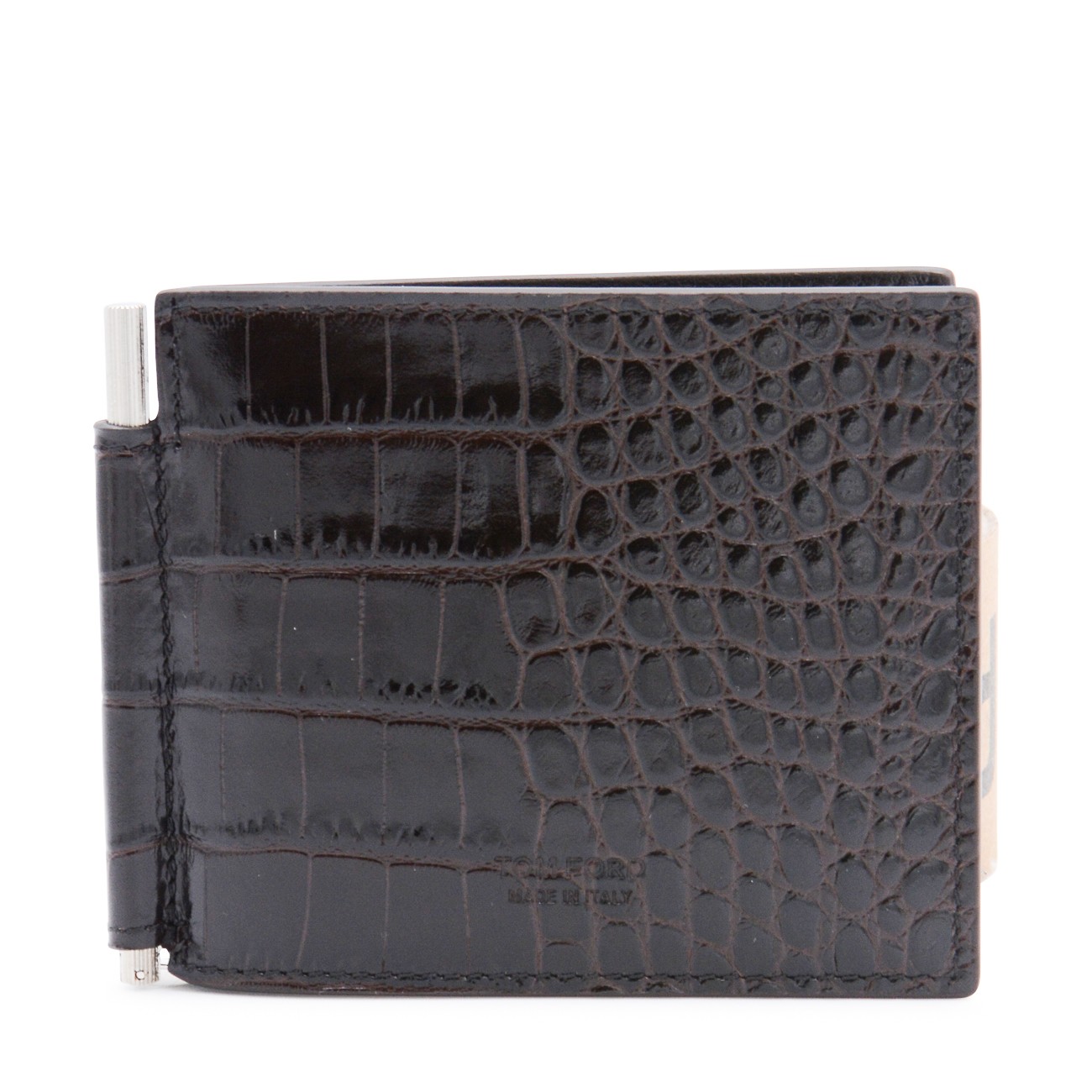 Dark brown leather wallet from Tom Ford featuring croco print, inside pocket and silver tone hardware.