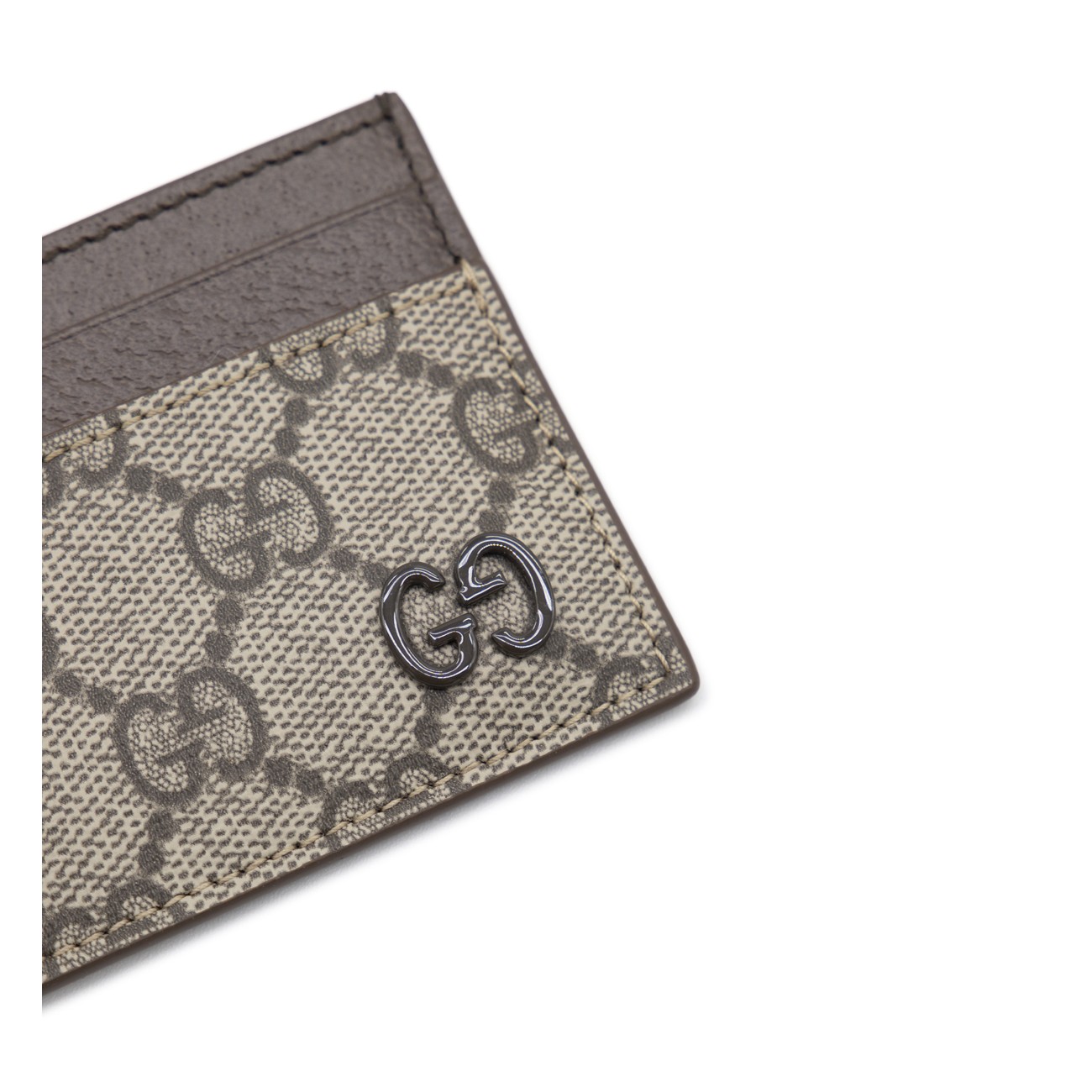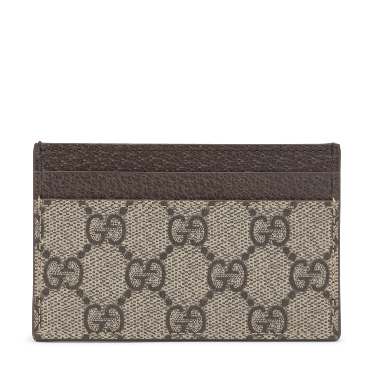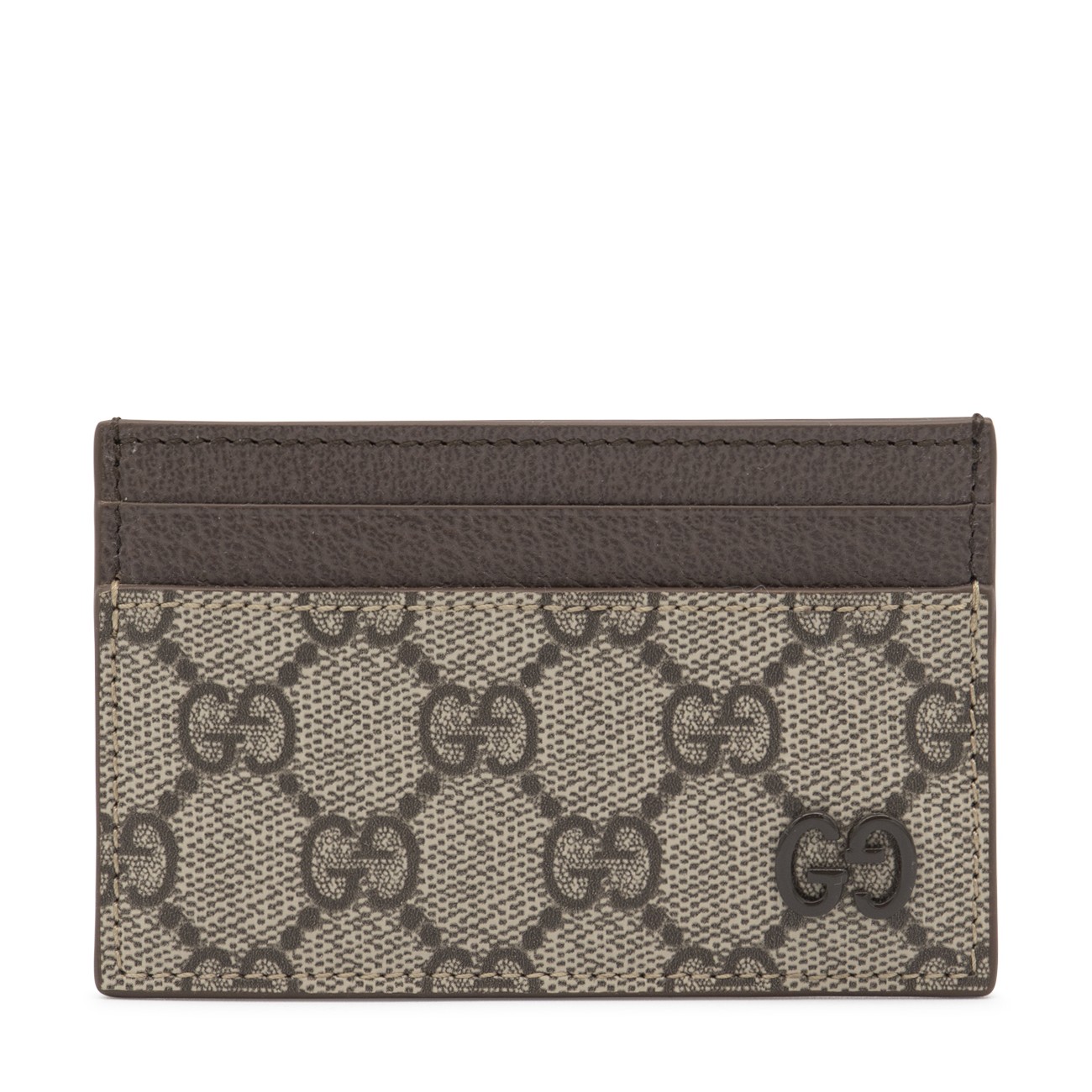 Brown leather card holder from Gucci featuring rectangular shape, GG motif, lettering logo and card slots.