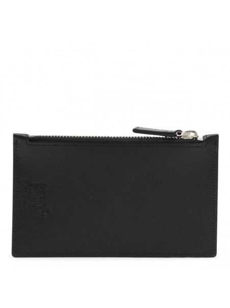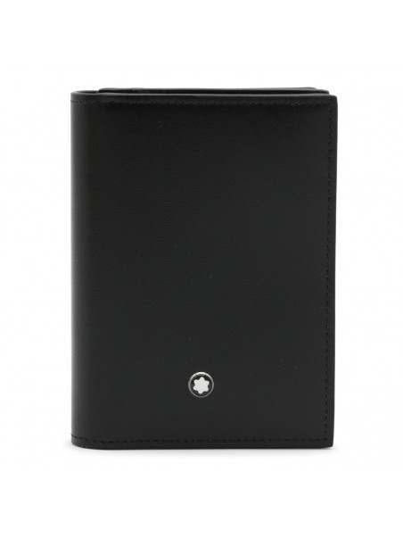 Black leather card holder from Montblanc featuring rectangular shape, zipped compartment and card slots.