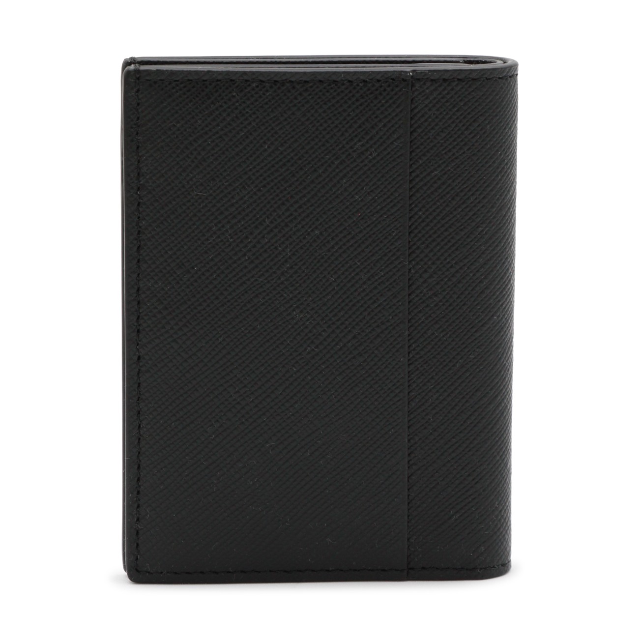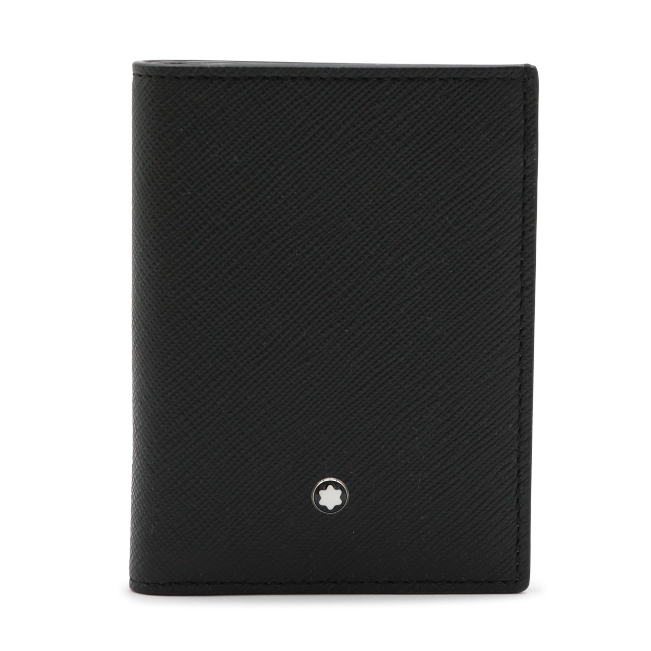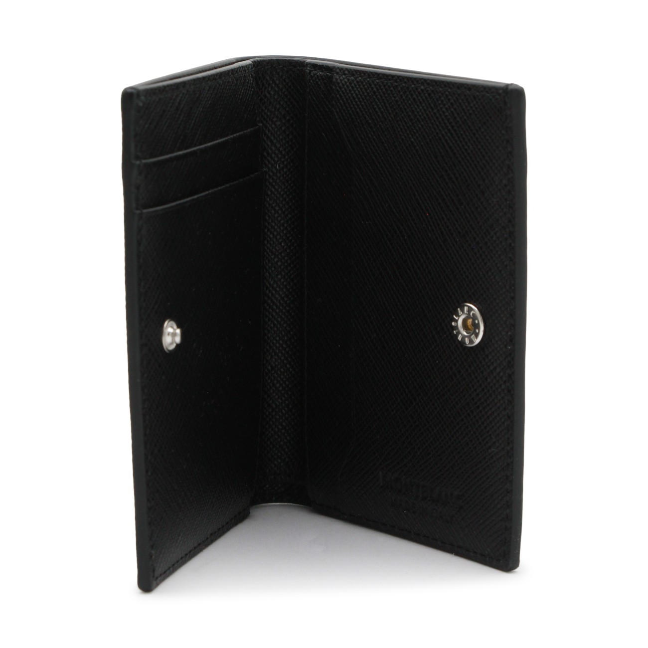 Black leather card holder from Montblanc featuring logo, snap button closure and card slots.