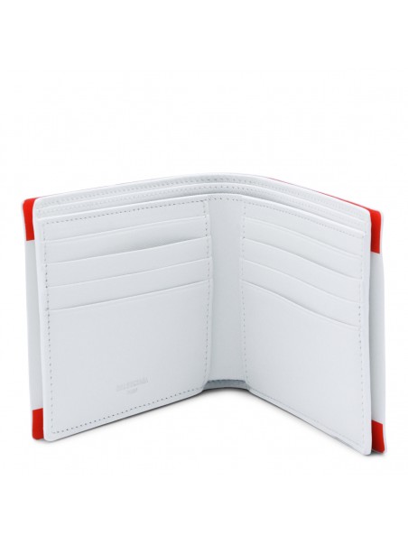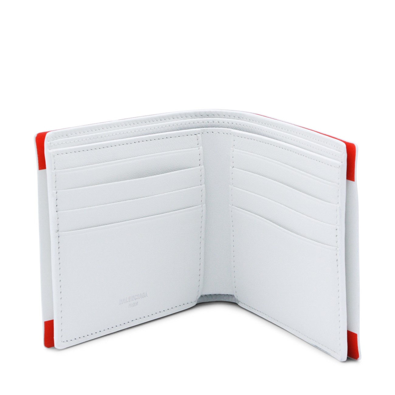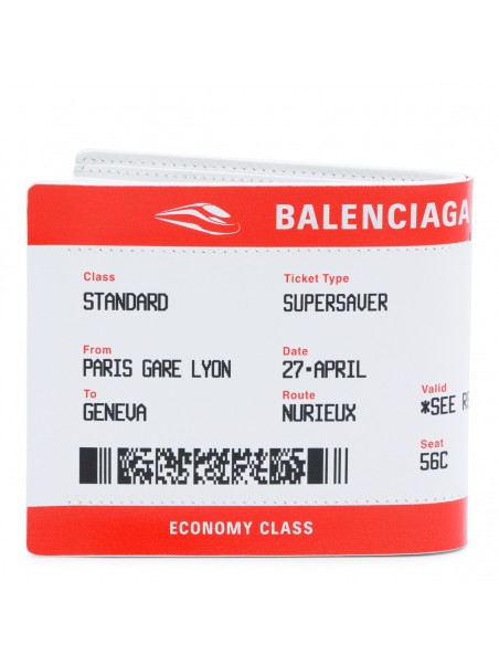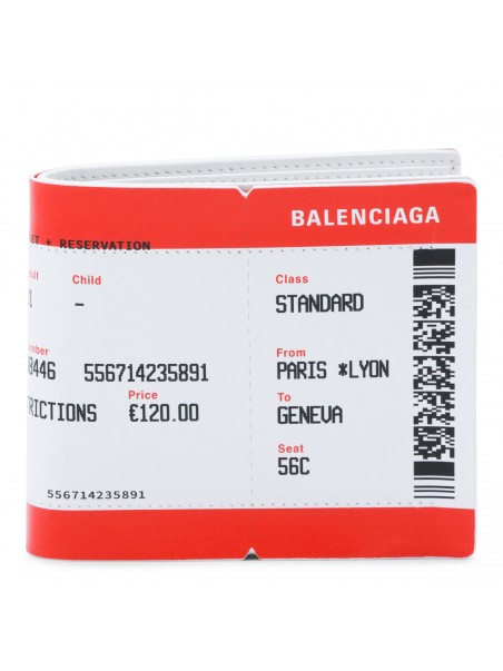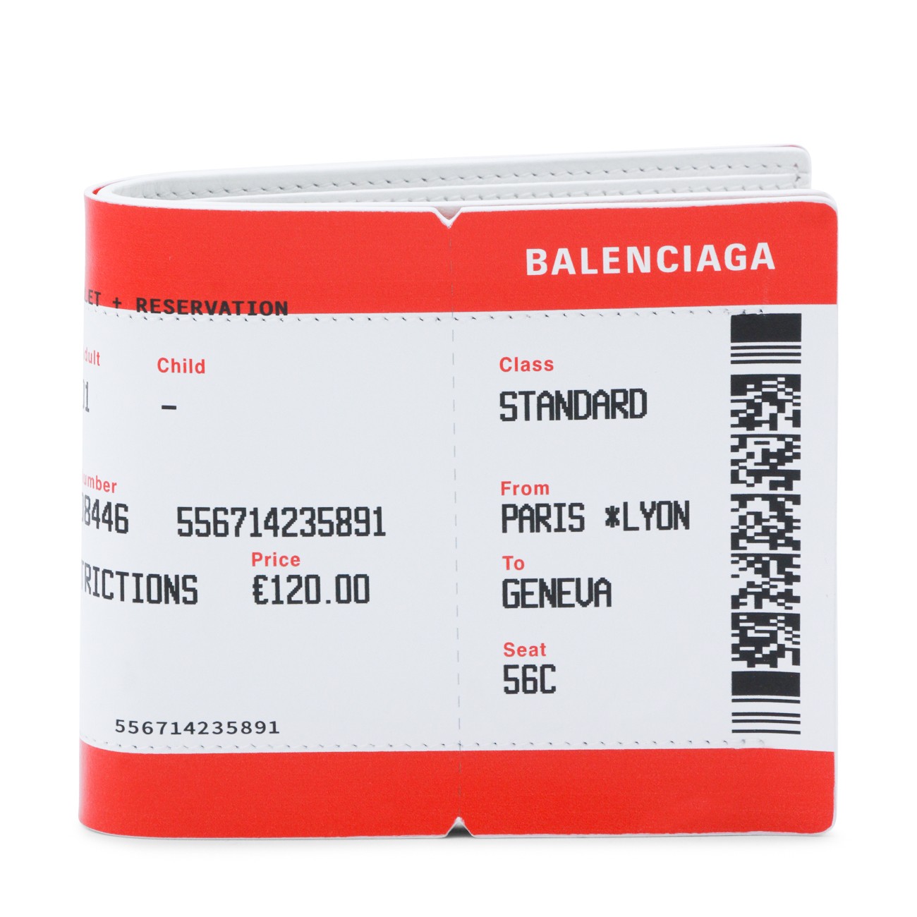 Red and white leather wallet from Balenciaga featuring all-over ticket print, notes compartment and card slots.