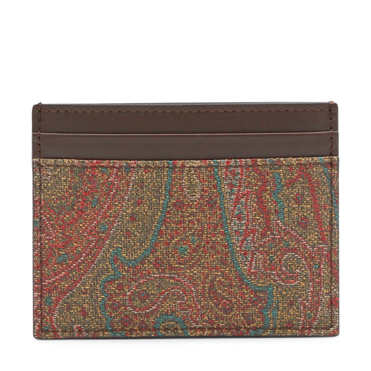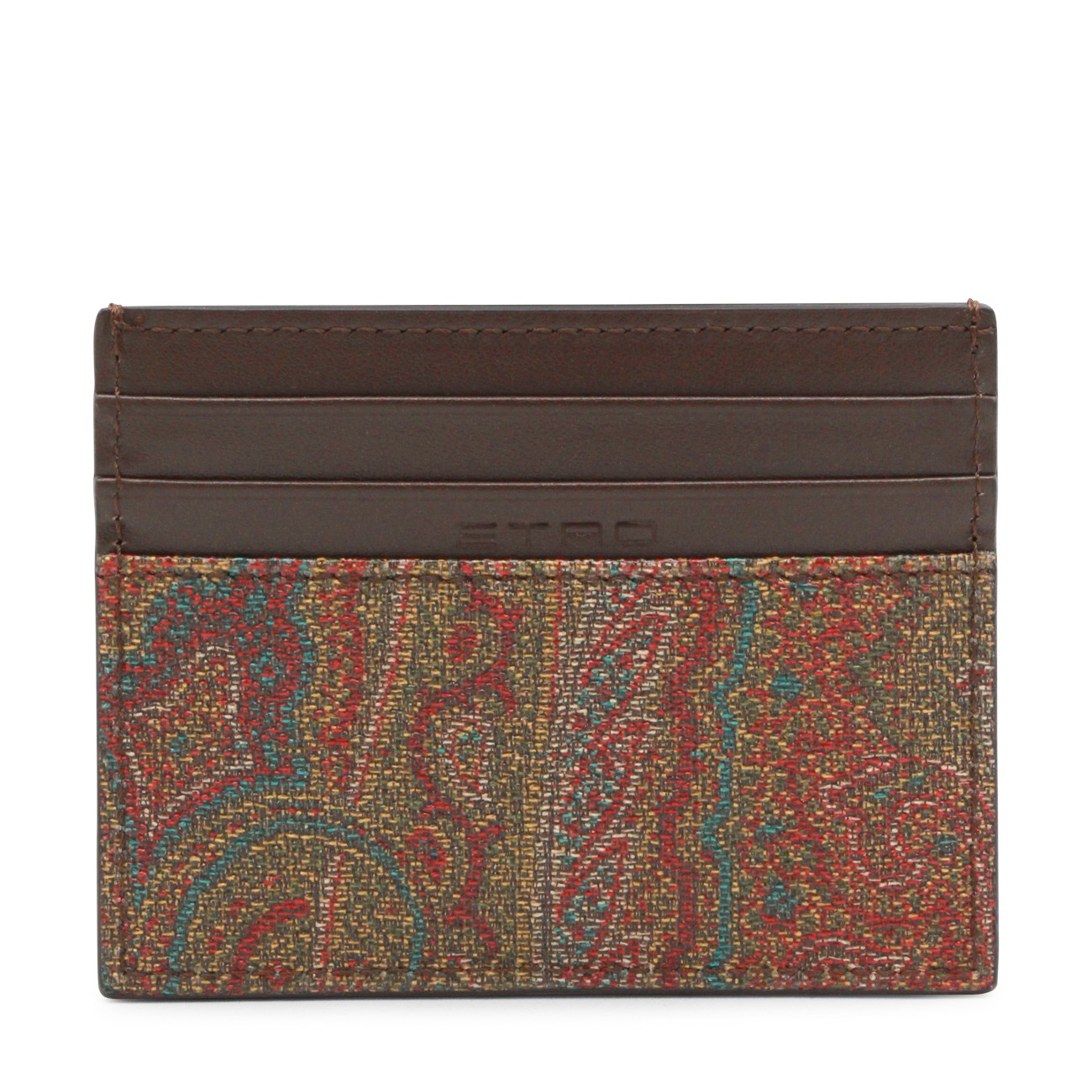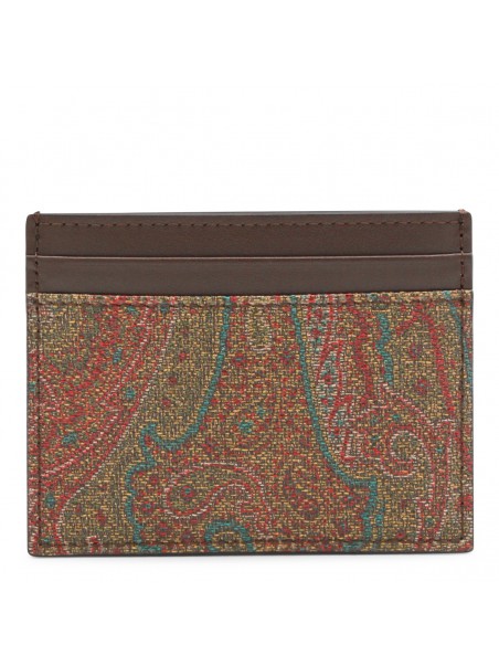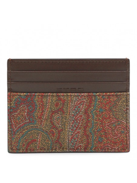 Brown card holder from Etro featuring rectangular shape, all over pattern and card holders.