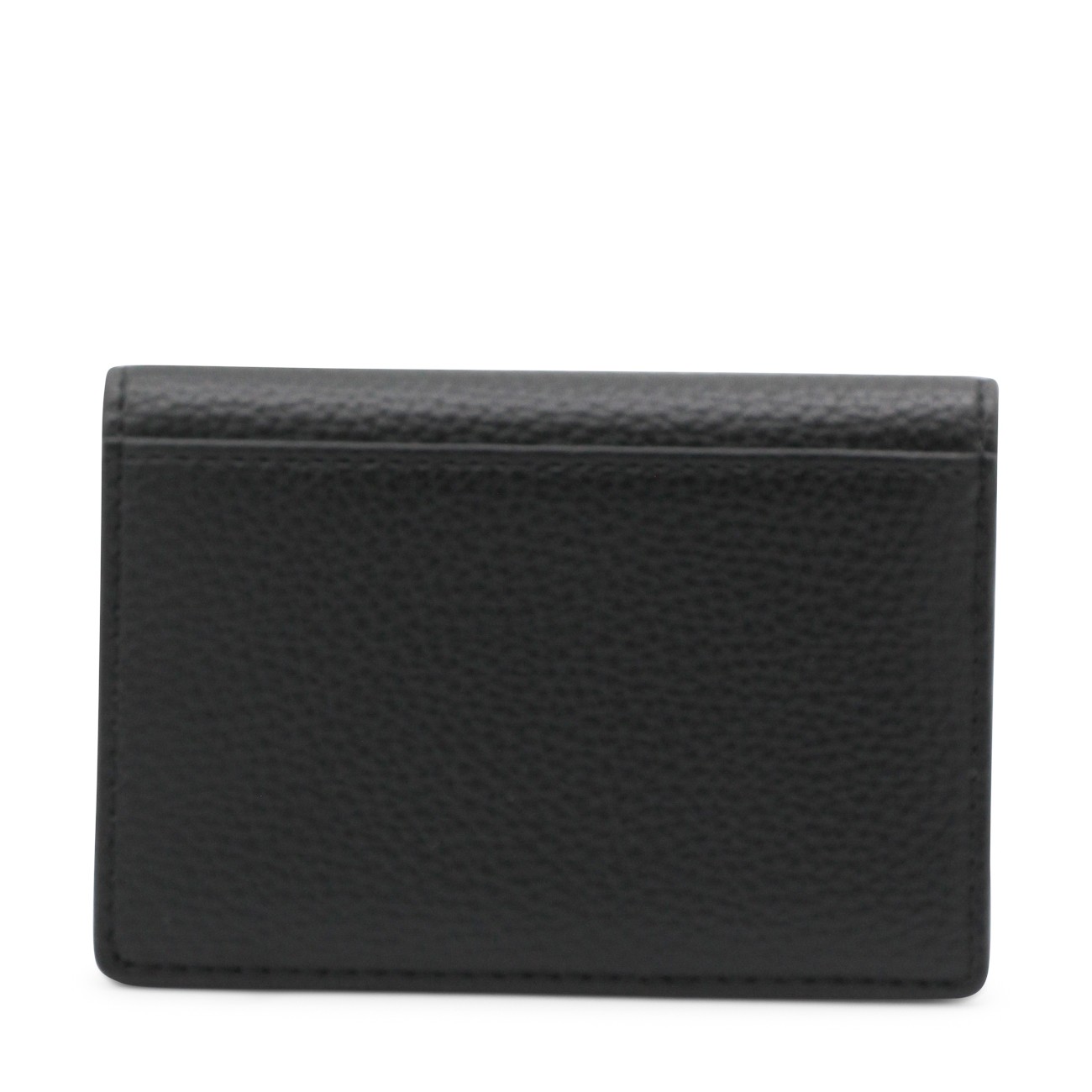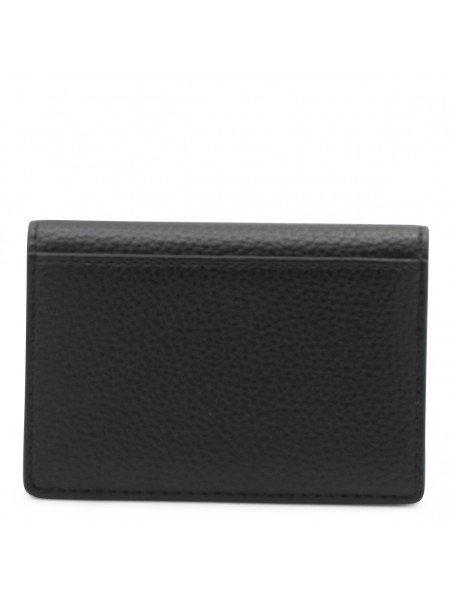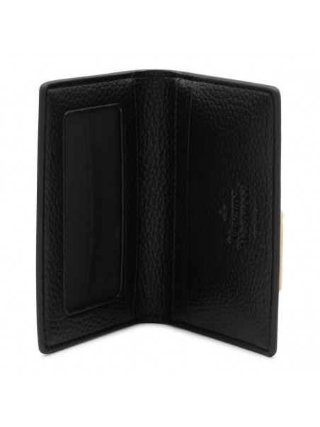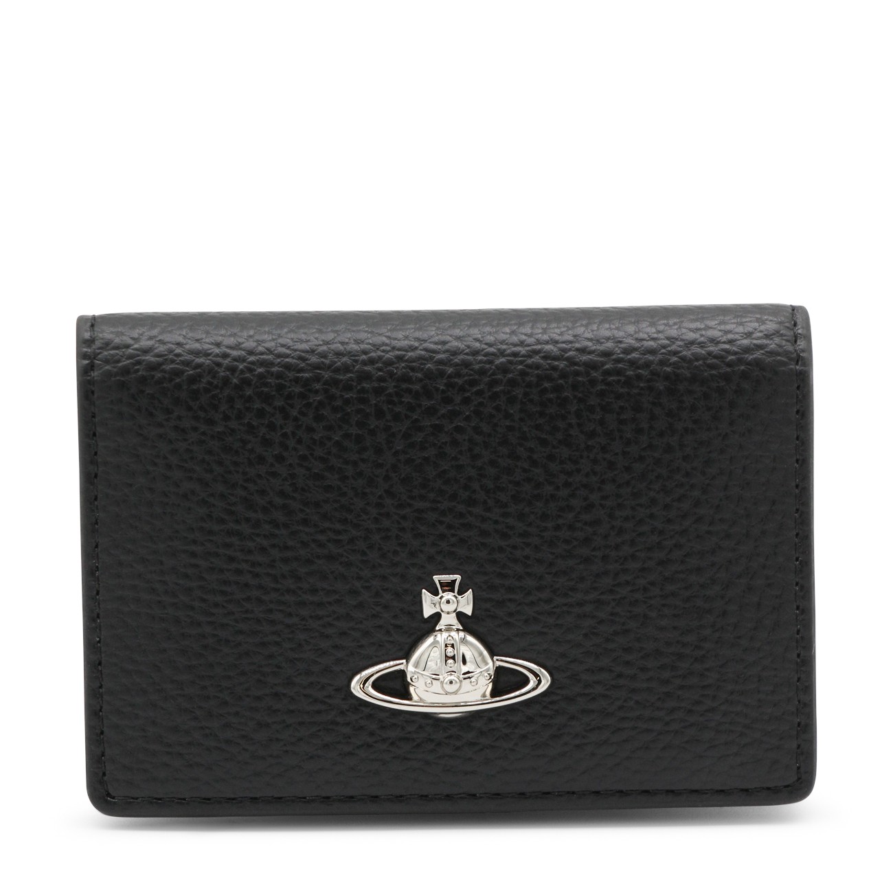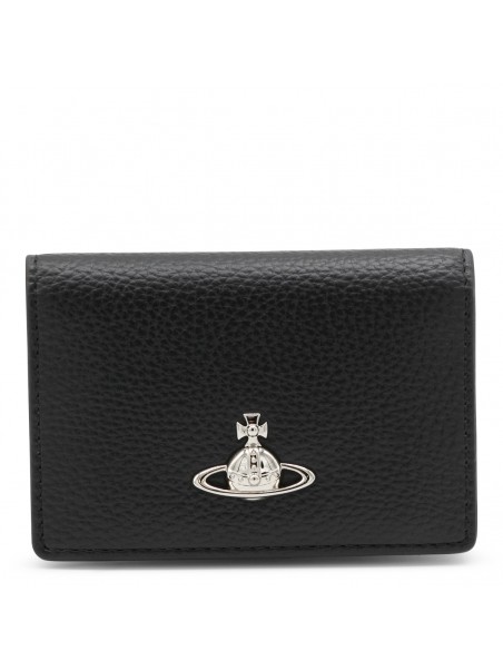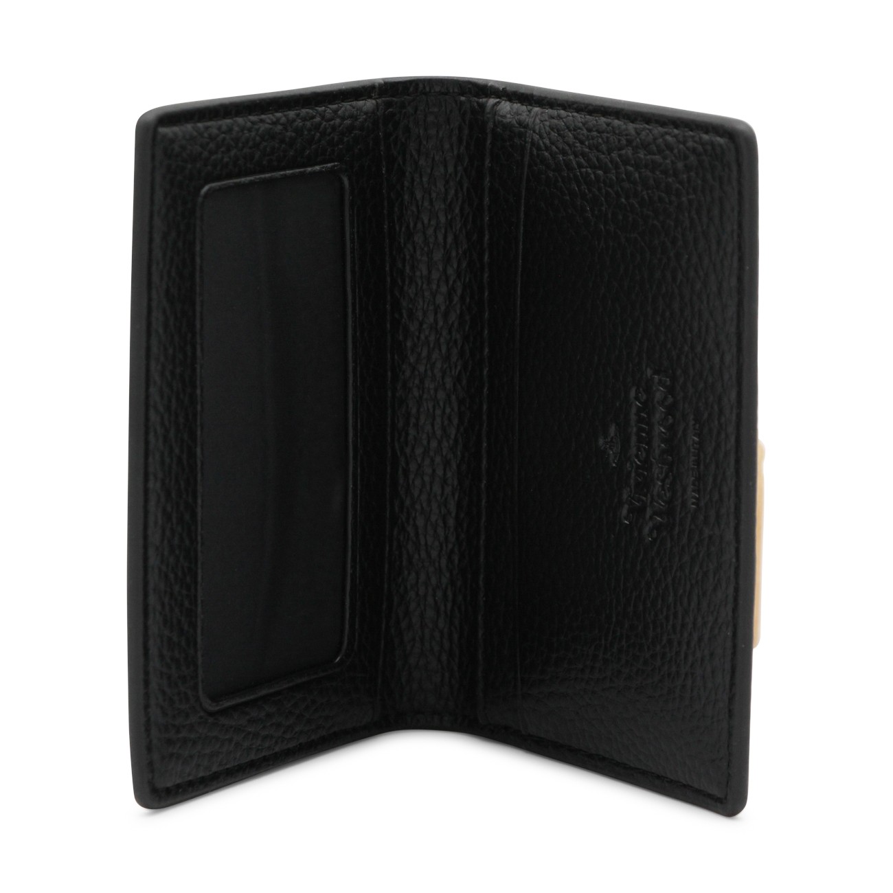 Black wallet from Vivienne Westwood featuring frontal silver tone logo and internal card holders.