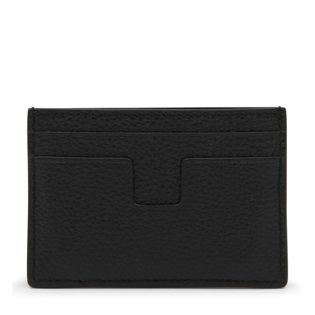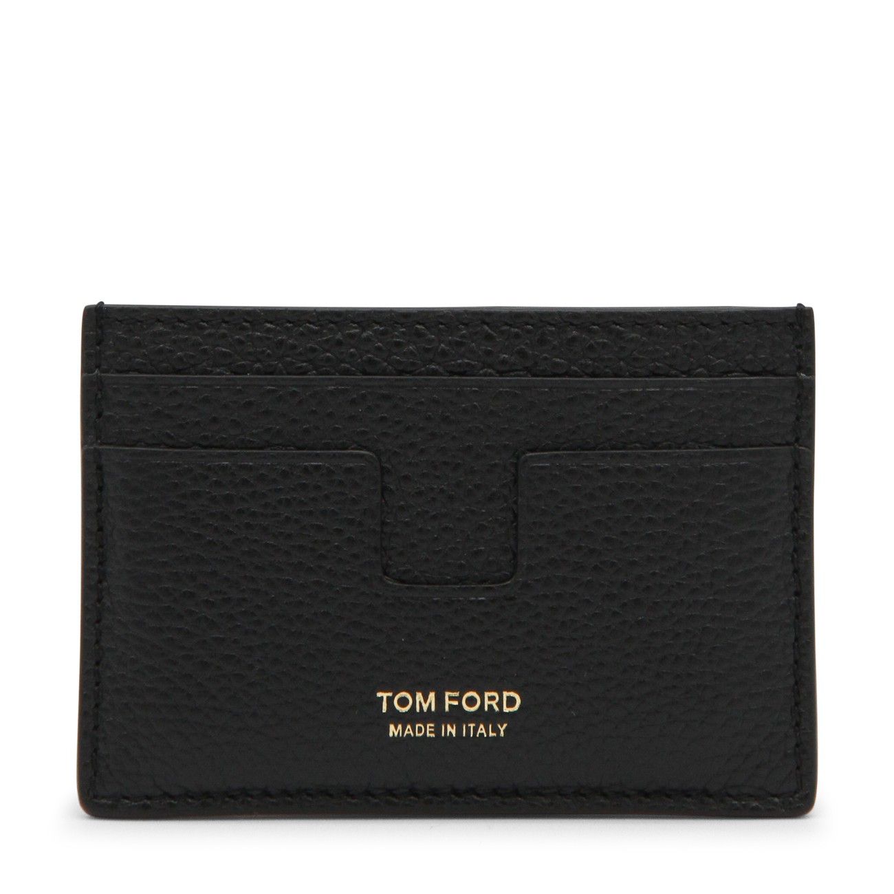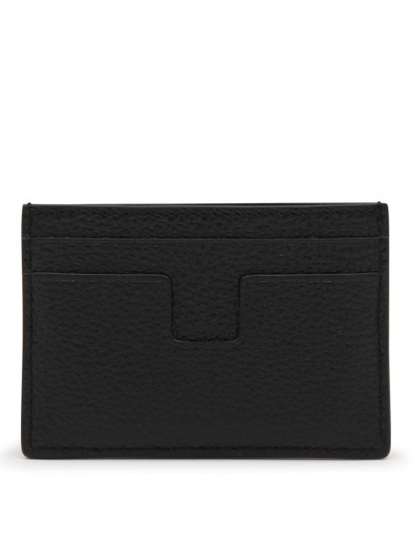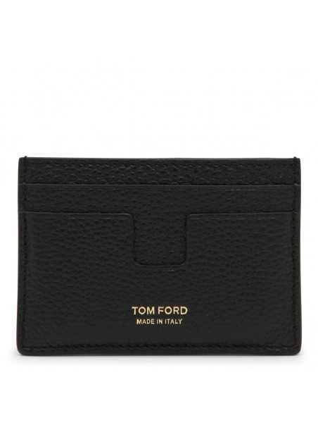 Black leather card holder from Tom Ford featuring card slots and frontal logo.
