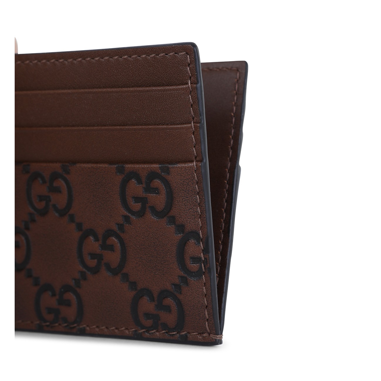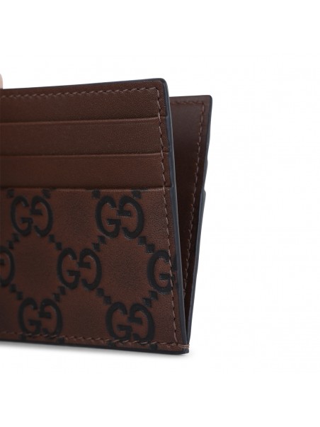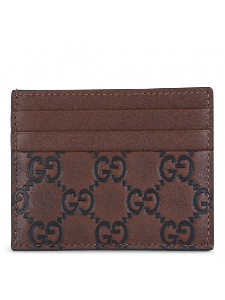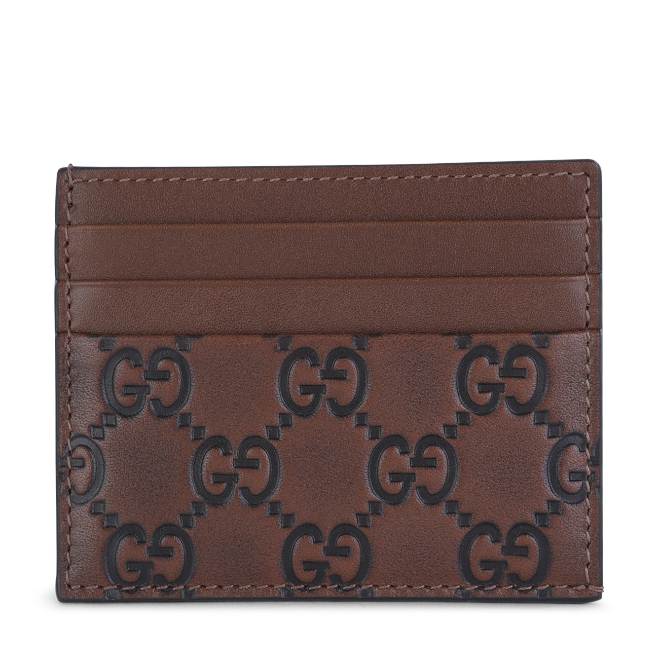 Brown leather card holder from Gucci featuring card slots and monogram.