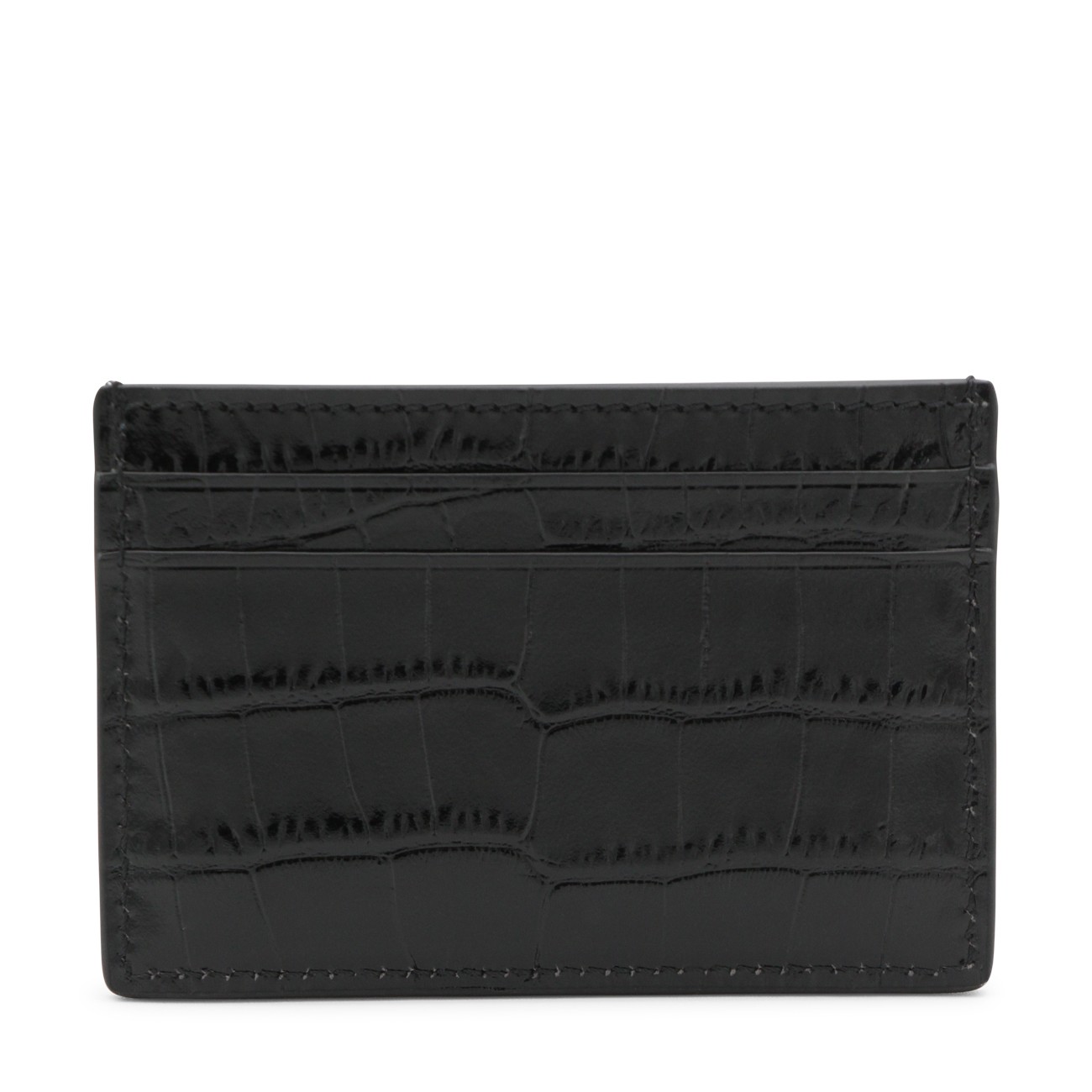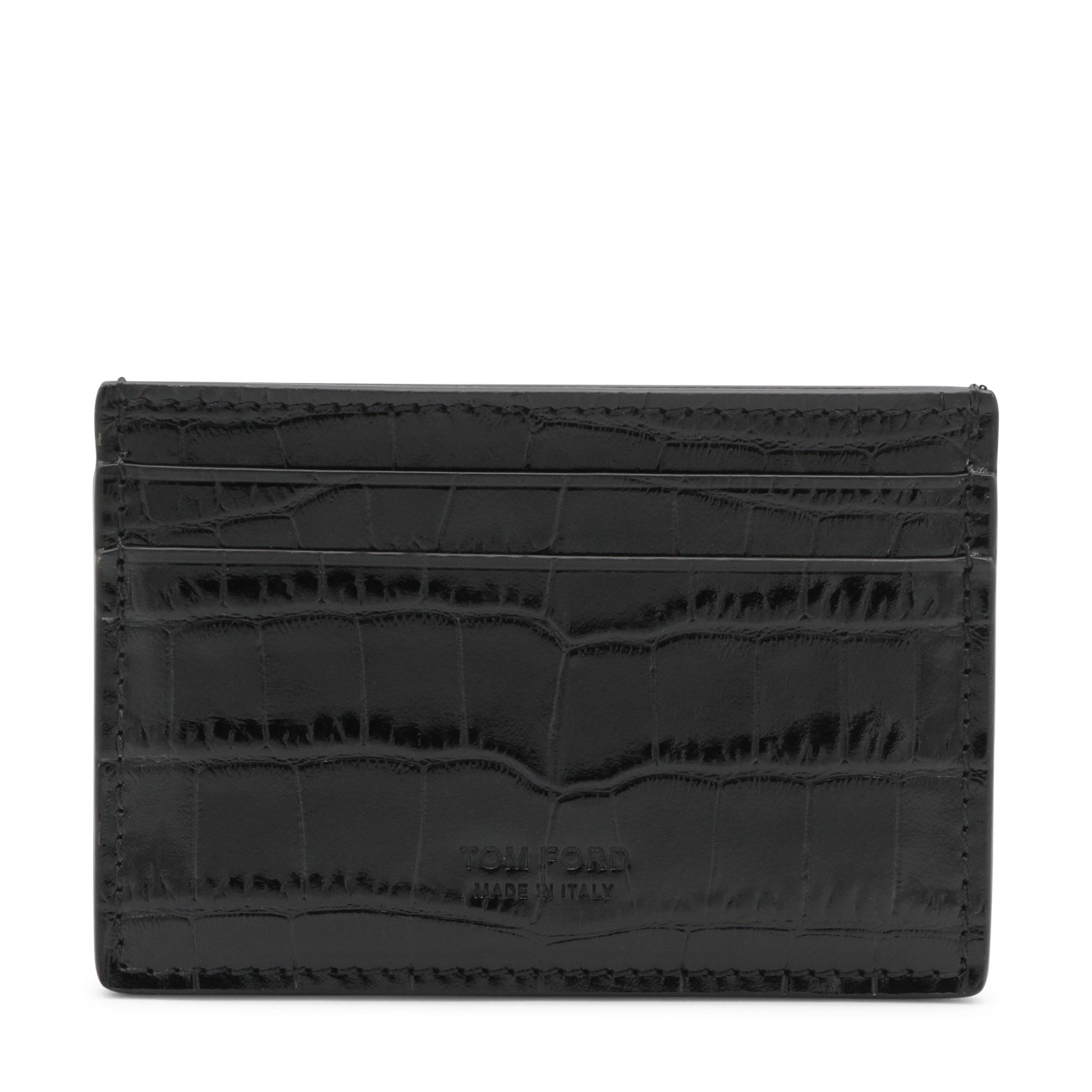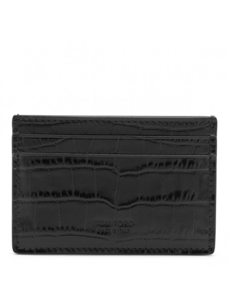 Black leather card holder from Tom Ford featuring card slots and engraved logo.