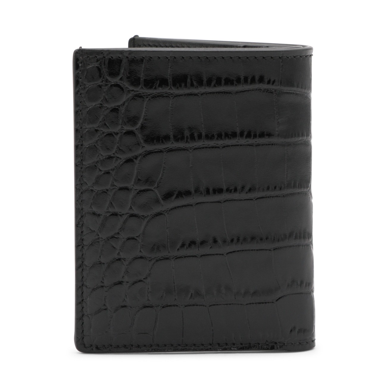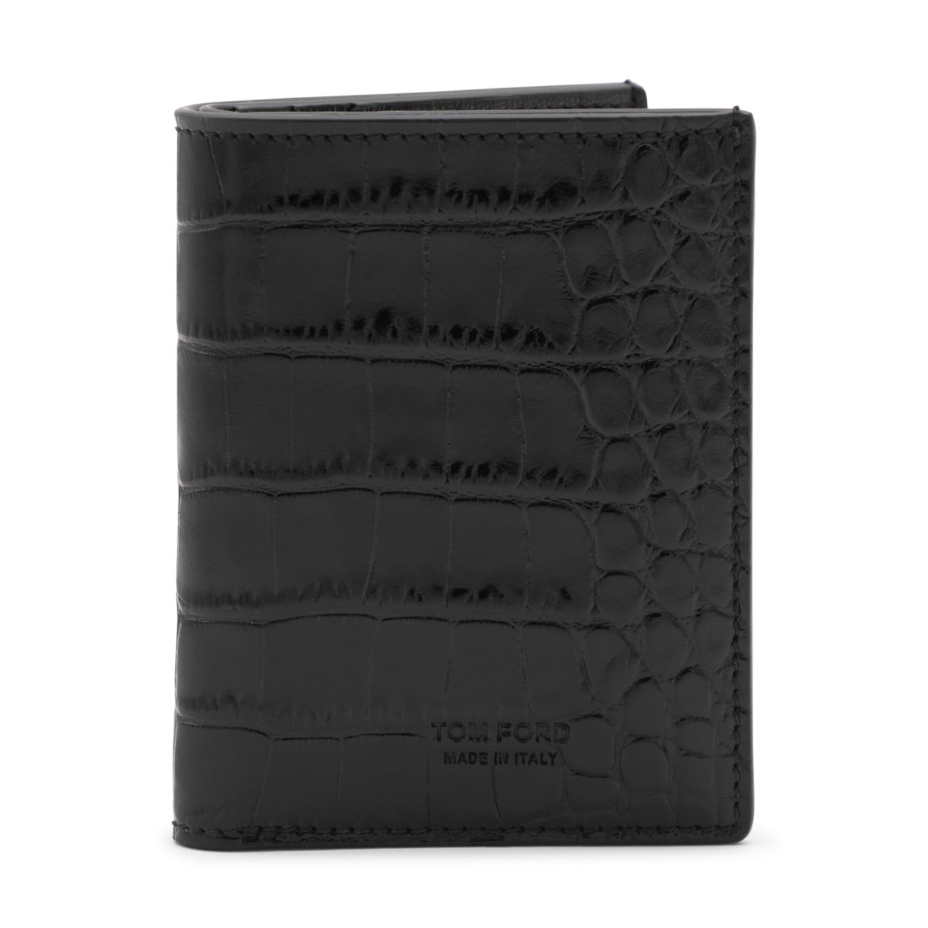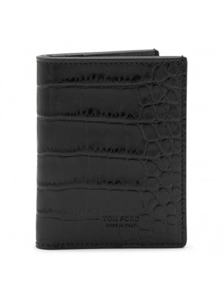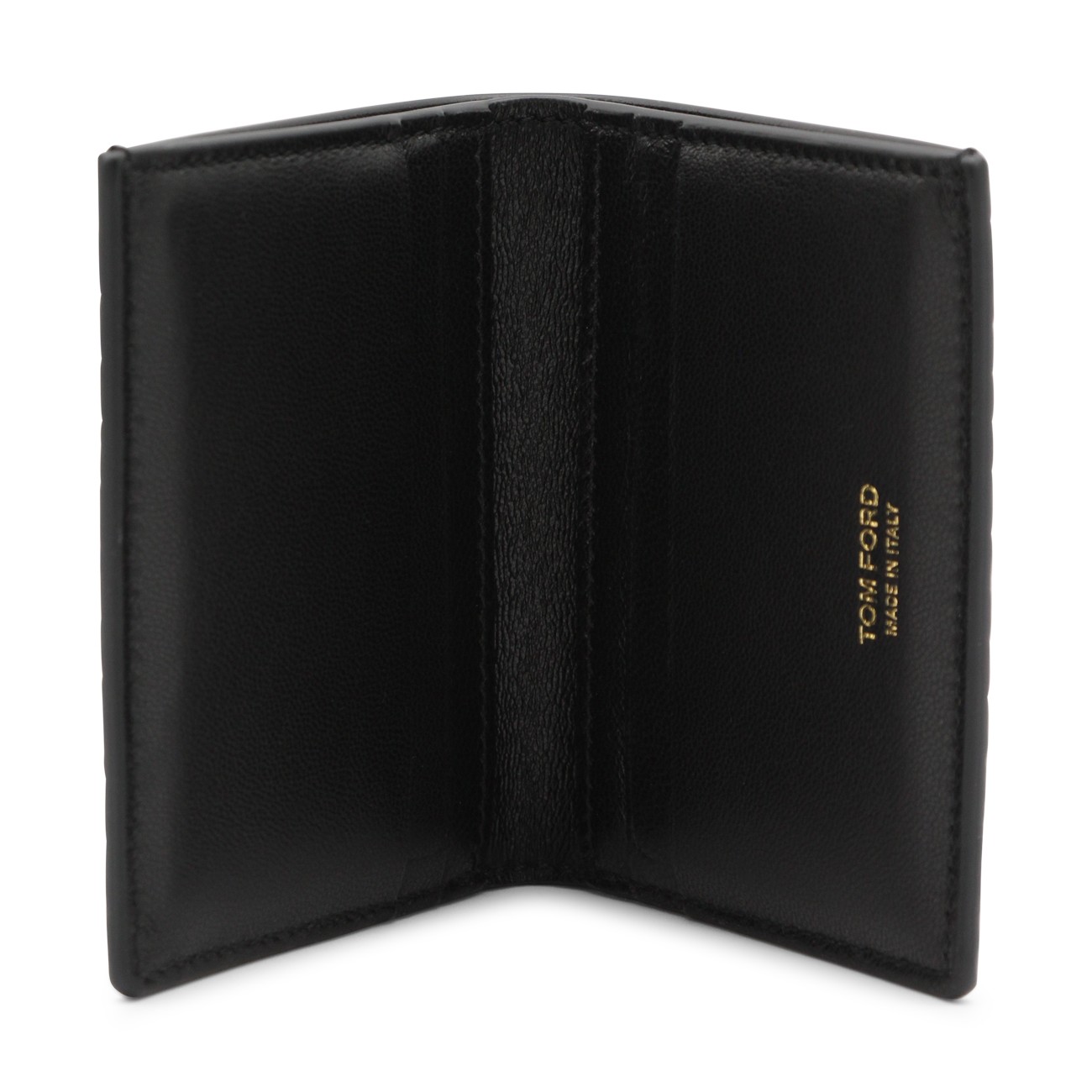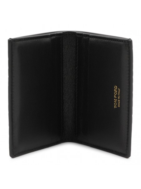 Black leather card holder from Tom Ford featuring card slots, pocket and engraved logo.