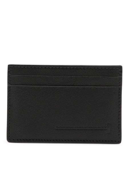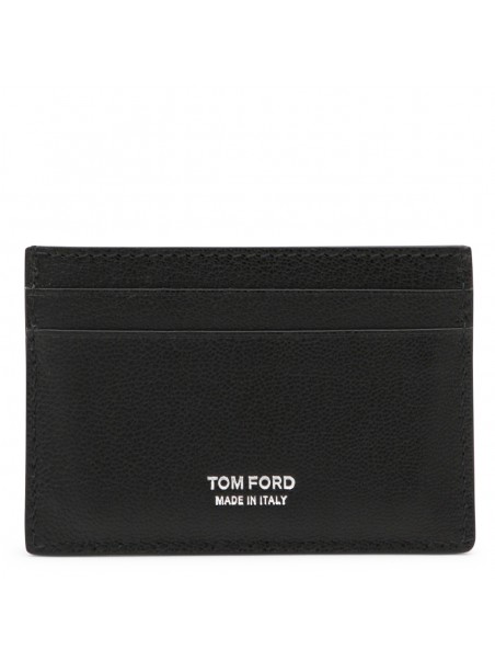 Black leather card holder from Tom Ford featuring silver tone logo and card slots.