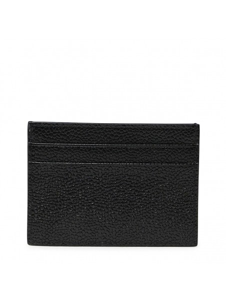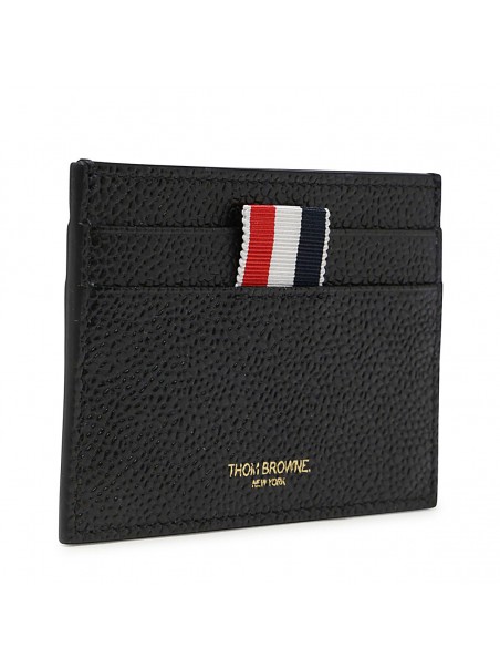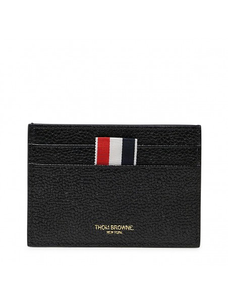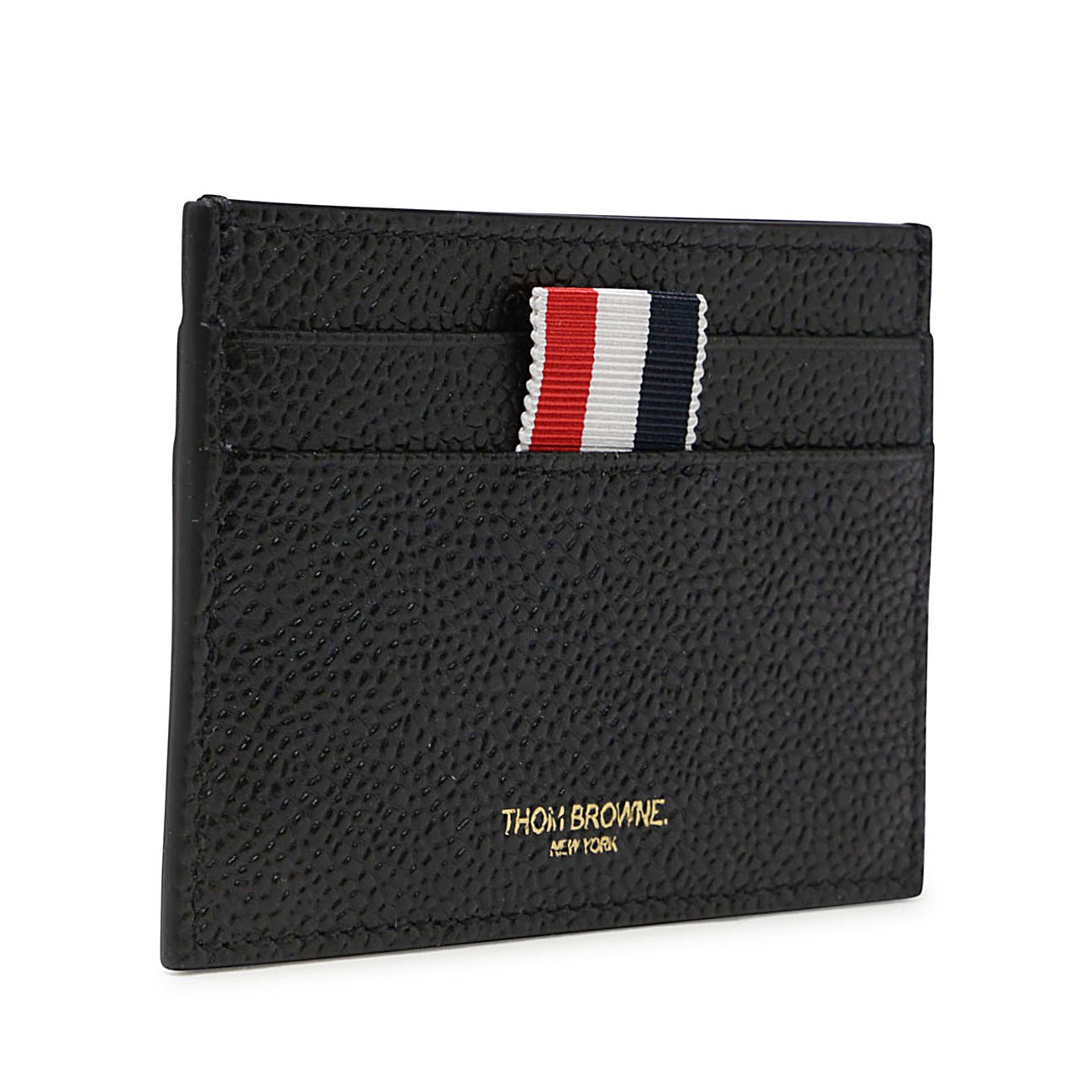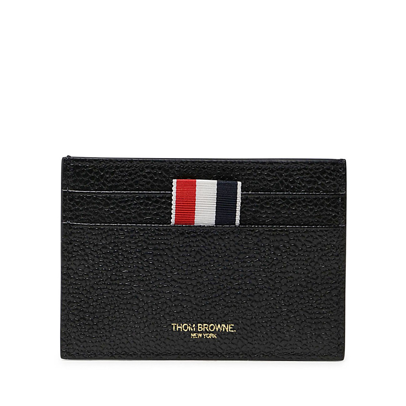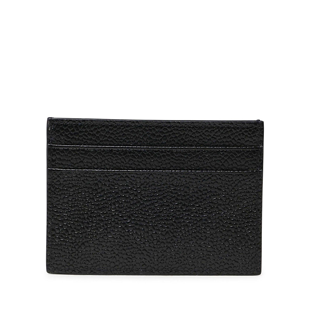 Black leather cardholder from Thom Browne featuring four card slots, a note compartment lined with the brand’s striped design and a metallic front logo stamp below the iconic striped tab.