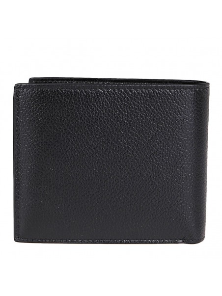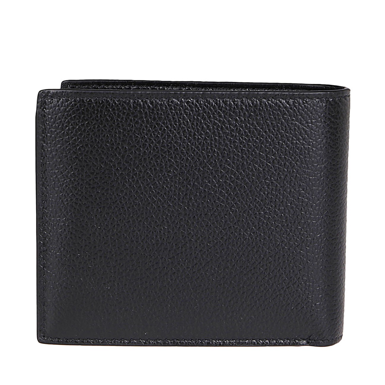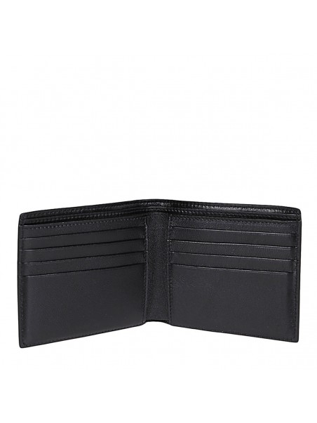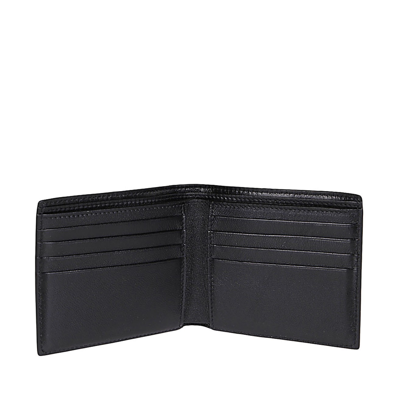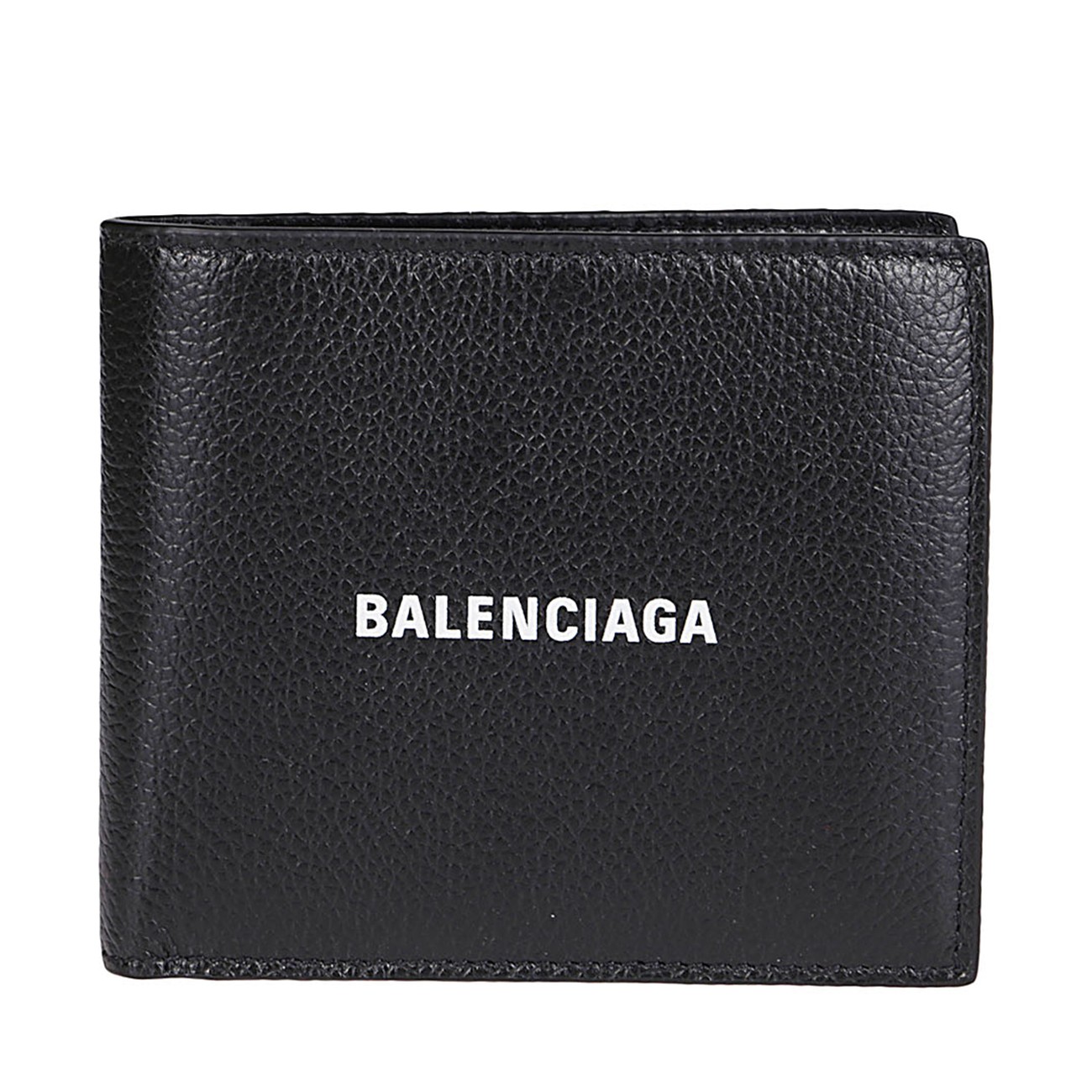 Black leather wallet from Balenciaga featuring printed logo on the front, card slots and pockets.