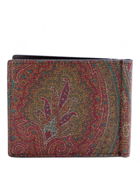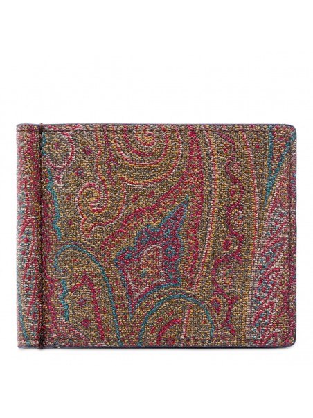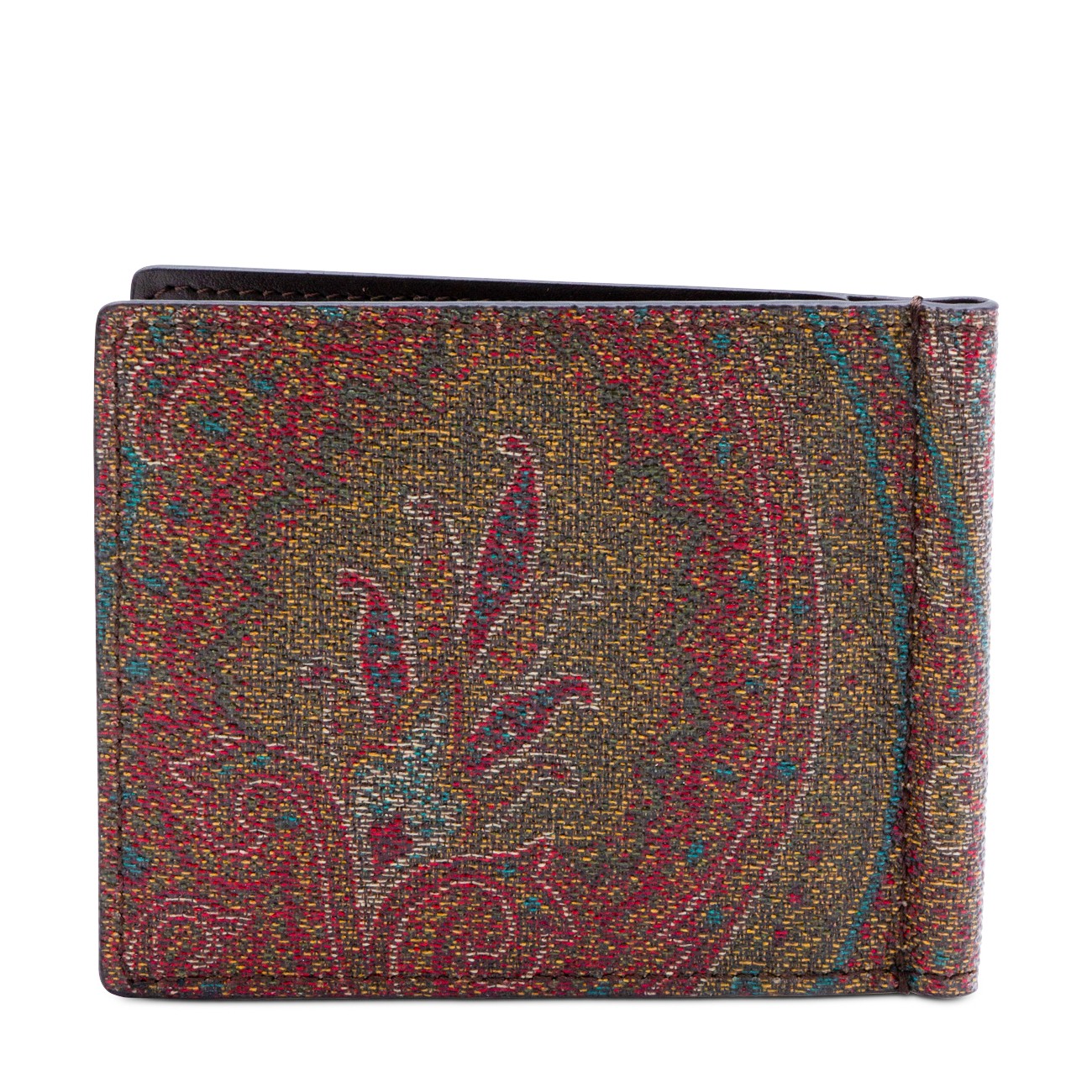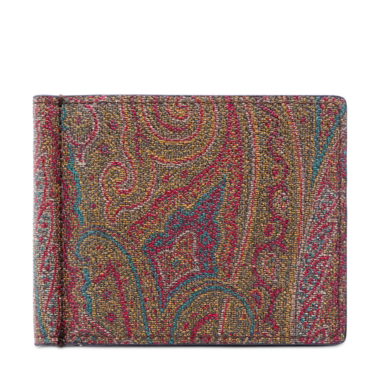 Paisley wallet from Etro featuring all over Paislet motif, money slots, eight card slots and logo details.