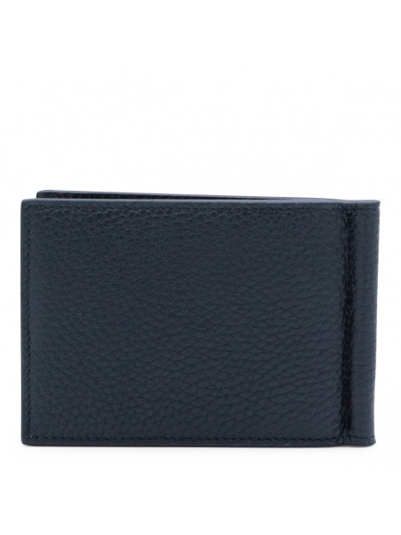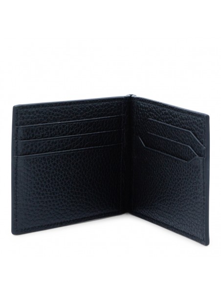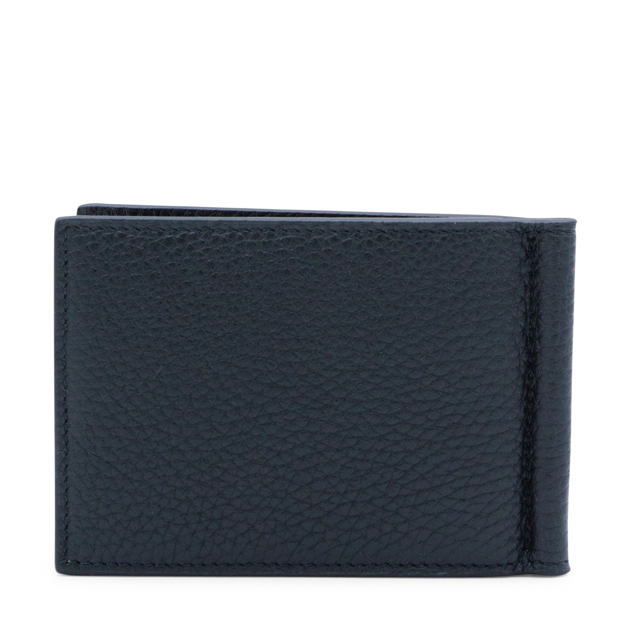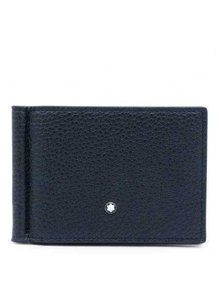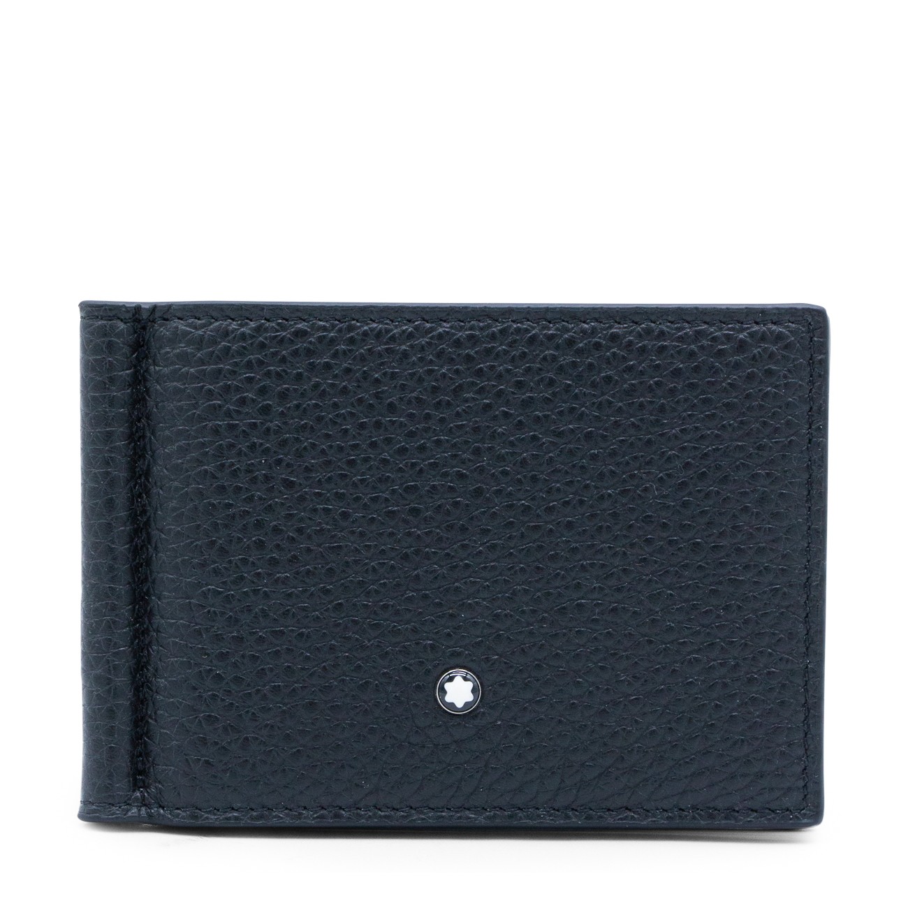 Black leather wallet from Montblanc featuring logo detail at front, silver tone metal hardware, six card slots and money compartment.