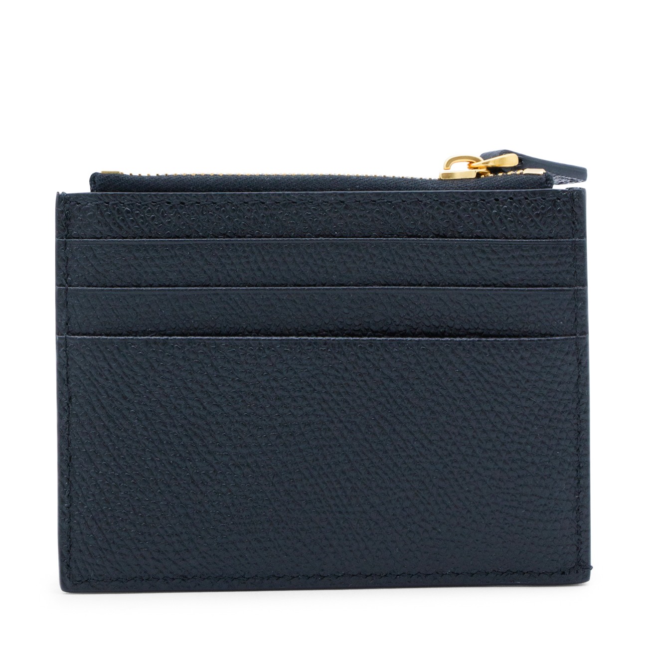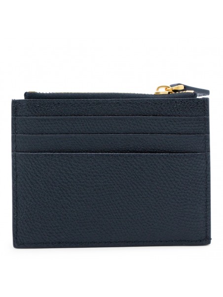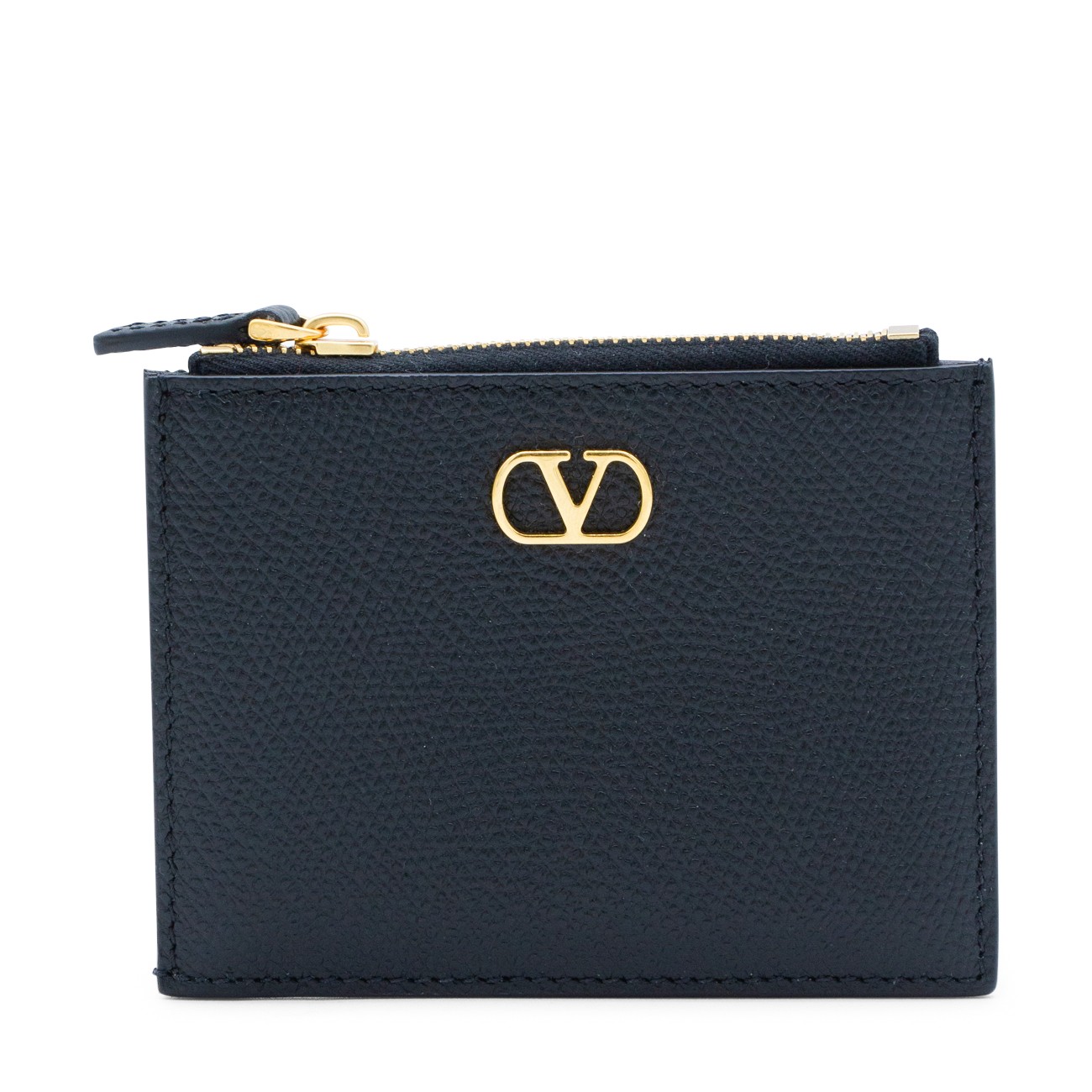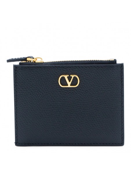 Black leather wallet from Valentino Garavani featuring rectangular shape, zip pocket, card slots and gold tone logo.