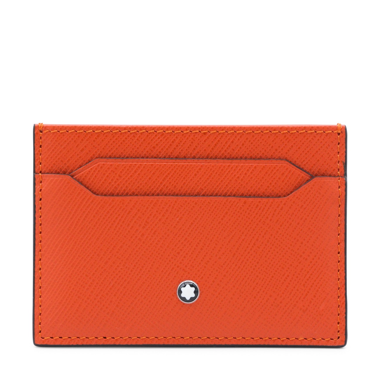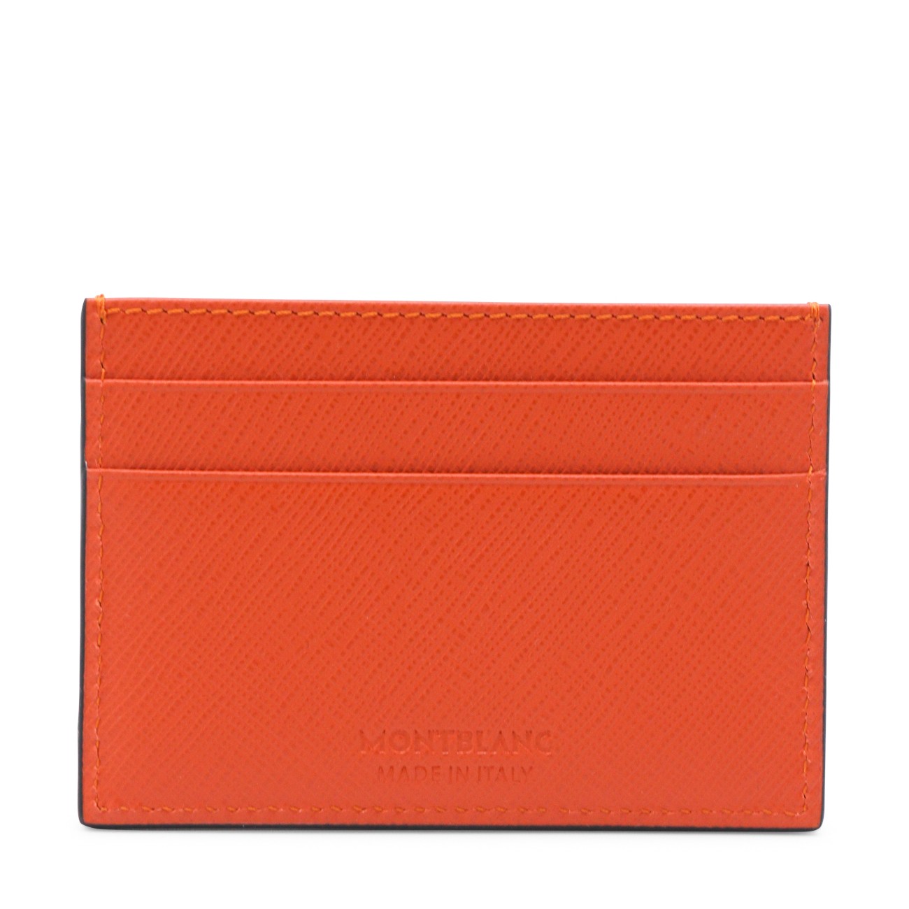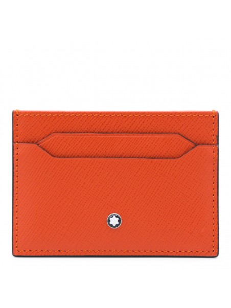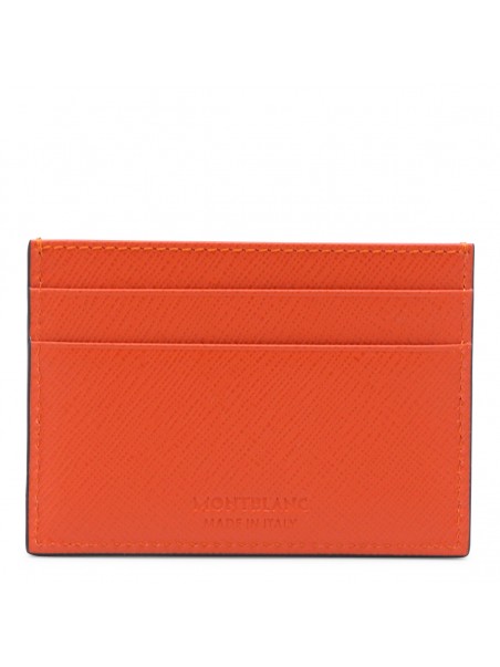 Orange leather card holder from Montblanc featuring rectangular shape, card slots and logo.