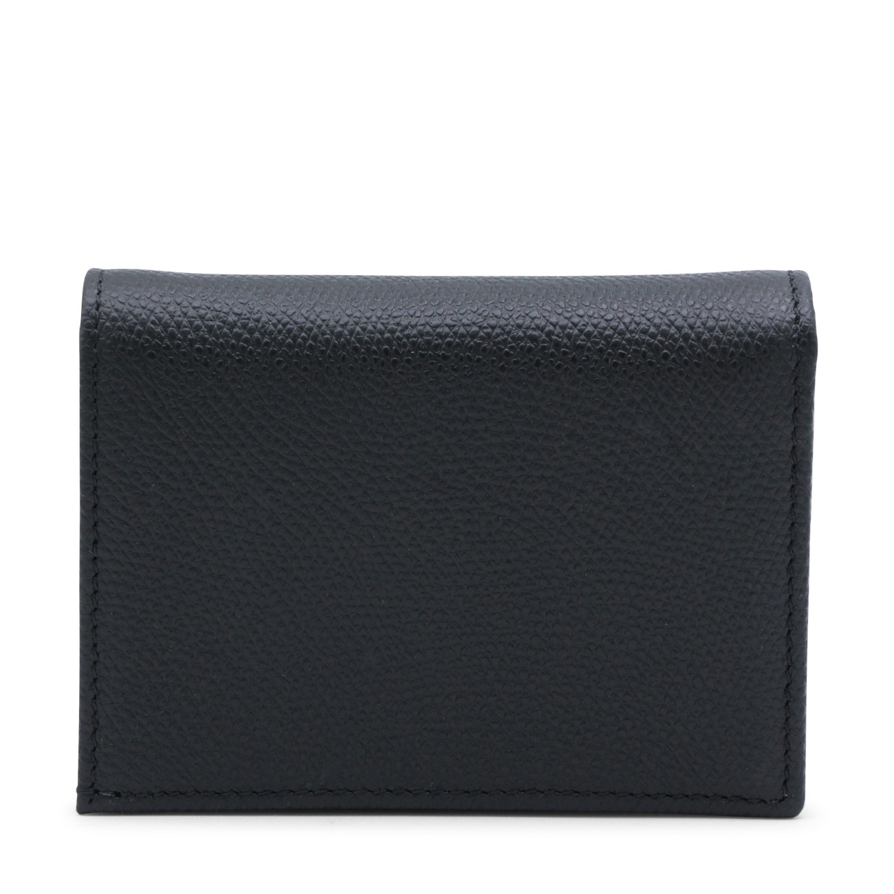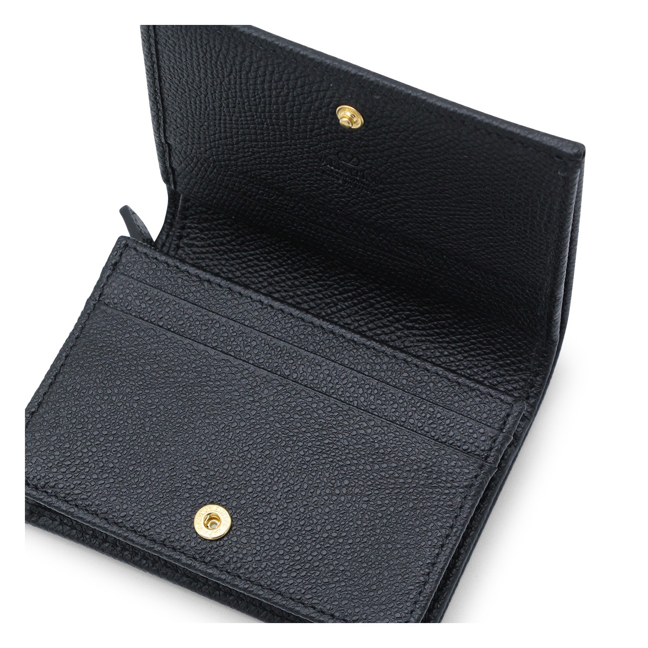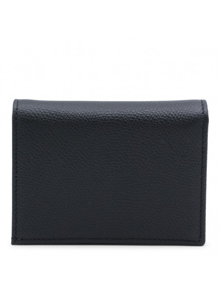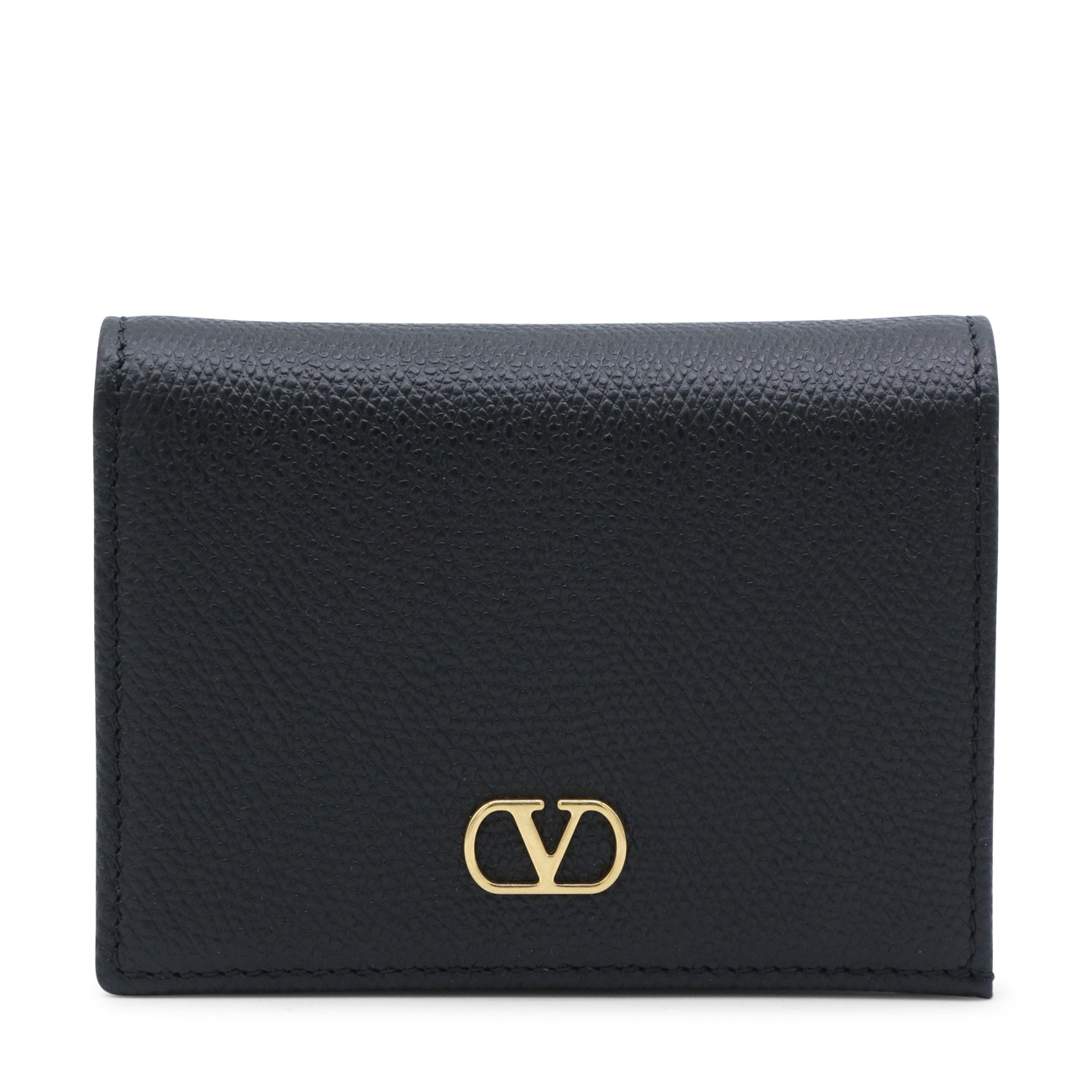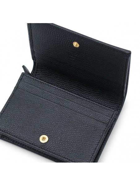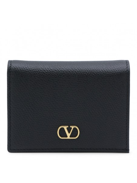 Black leather wallet from Valentino Garavani featuring frontal gold tone logo and inside pocket.