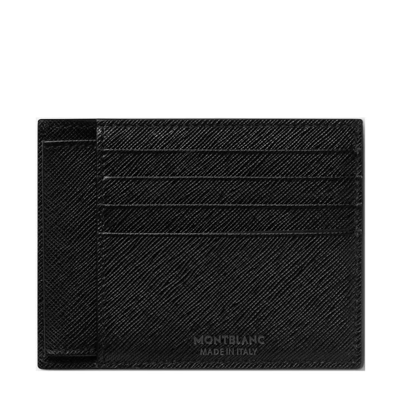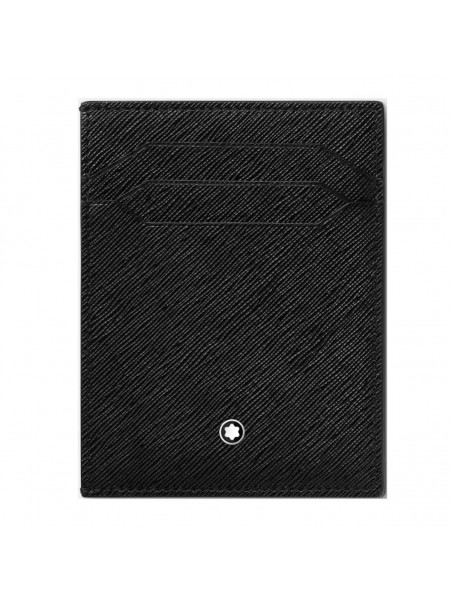 Black leather card holder from Montblanc featuring internal engraved logo and card slots.