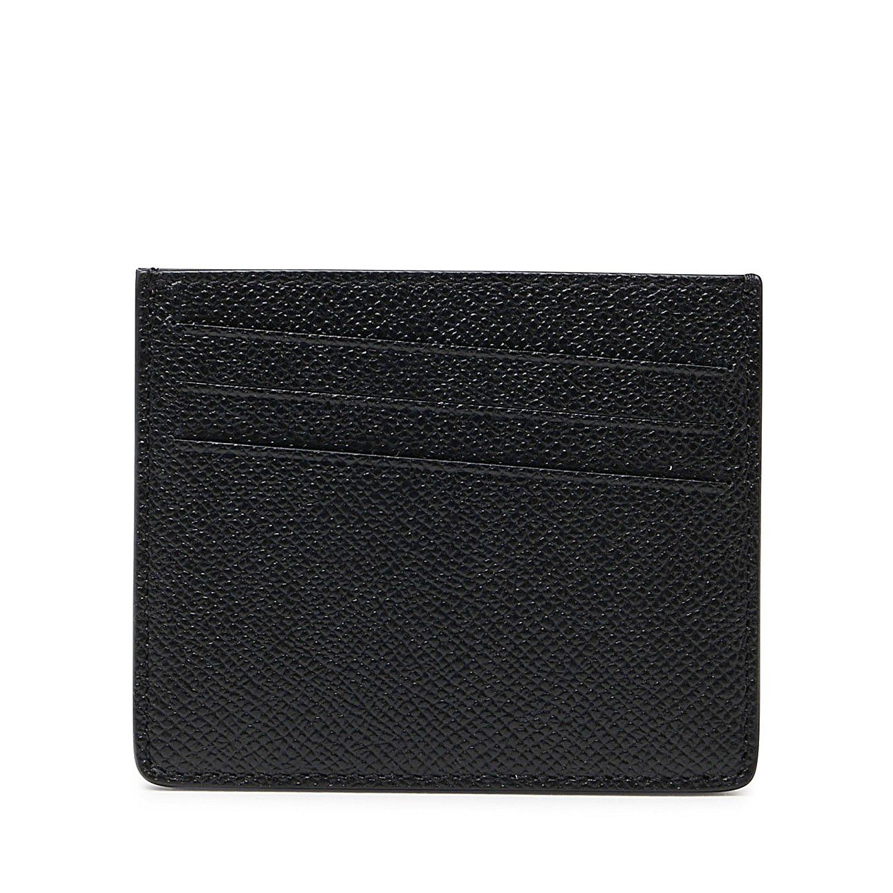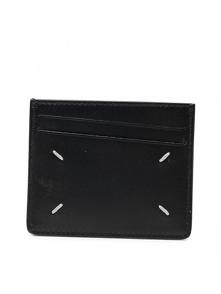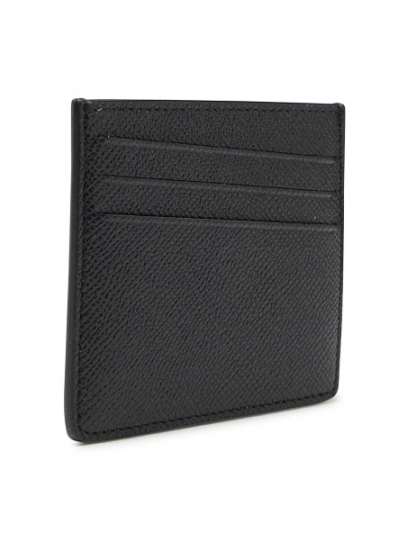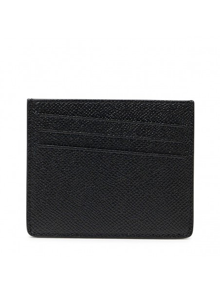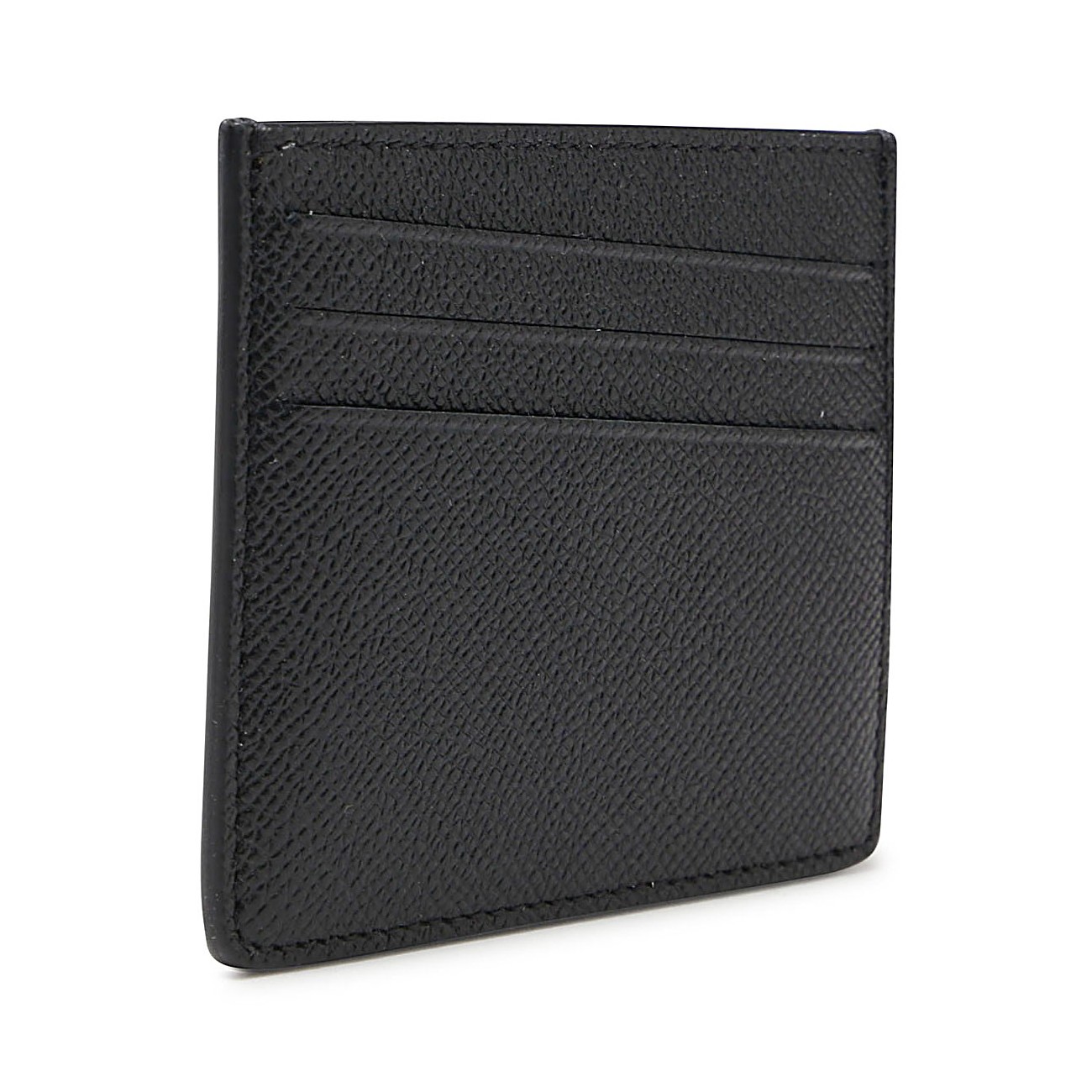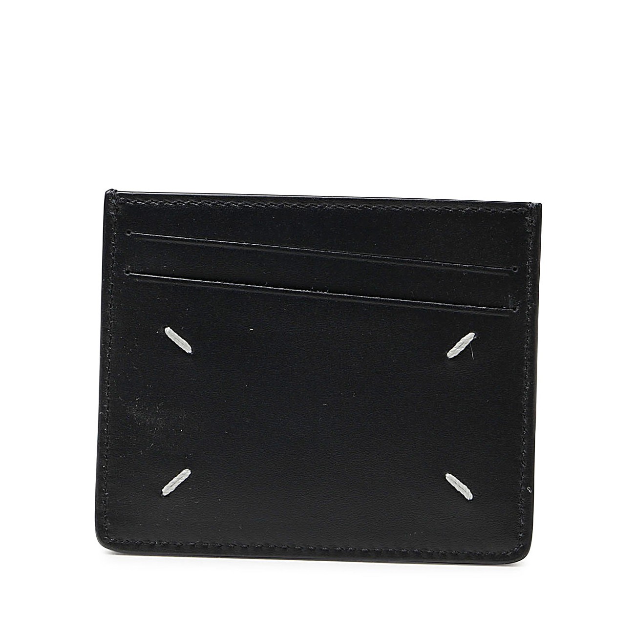 Black leather cardholder from Maison Margiela featuring a pebbled texture, oblique cut card slots and contrasting stitching details.