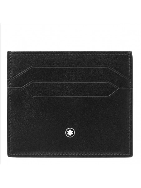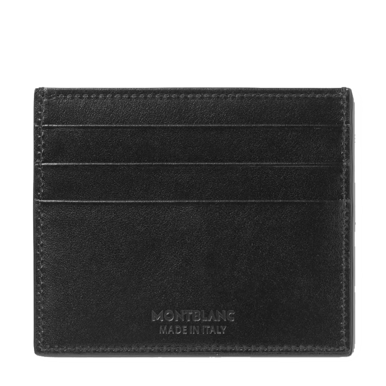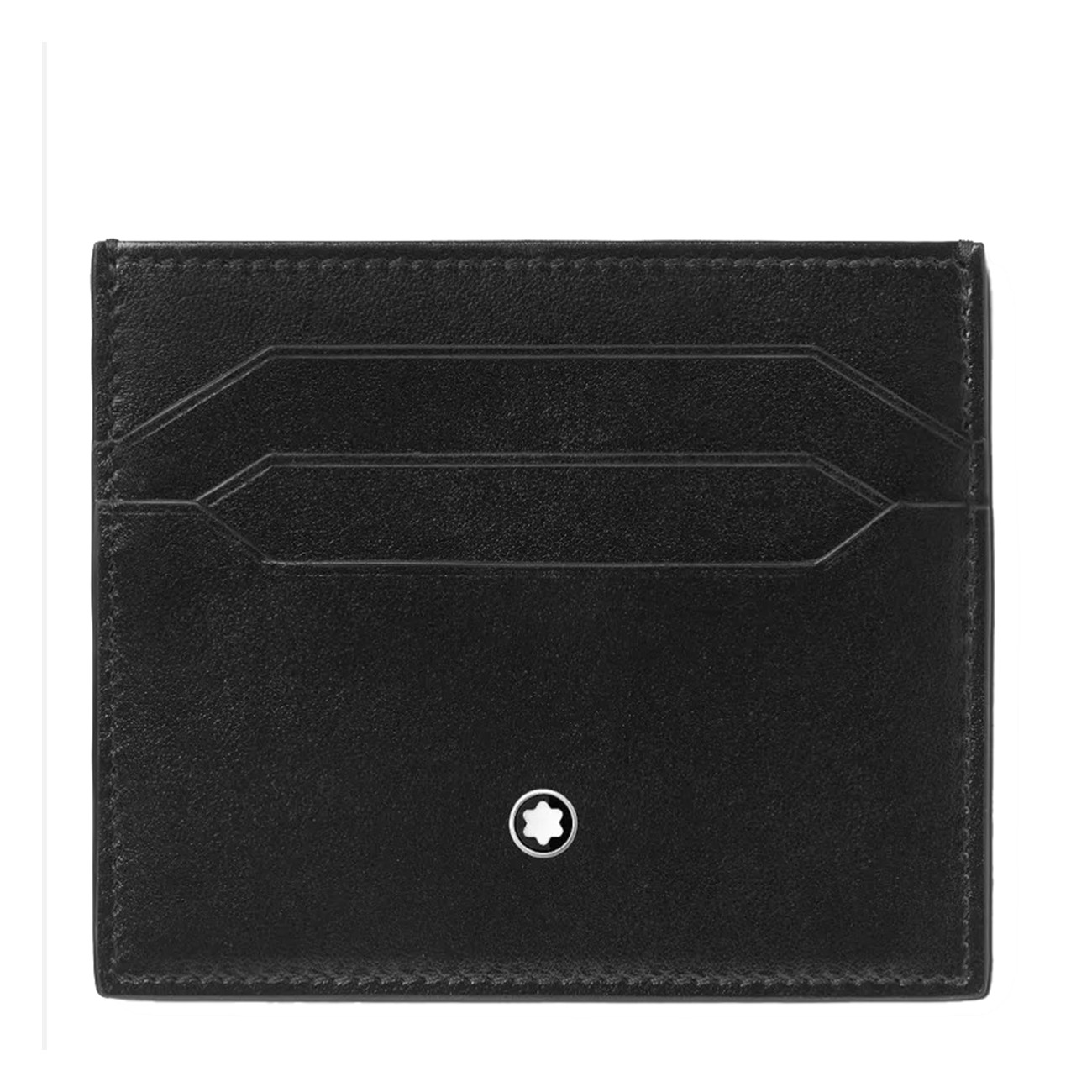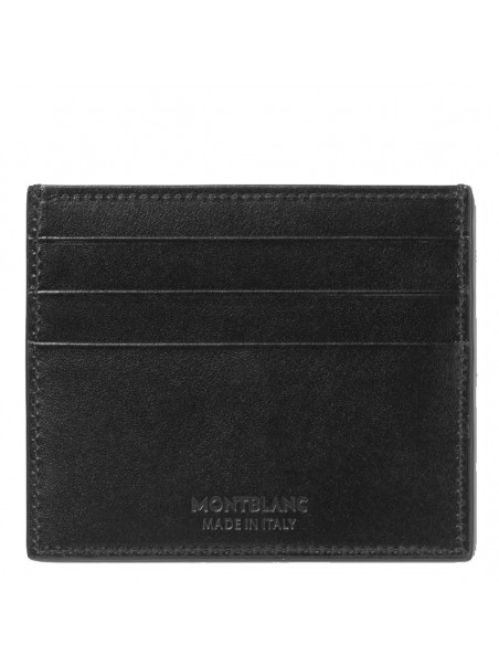 Black leather card holder from Montblanc featuring cards slot and silver tone logo hardware.