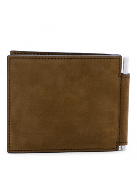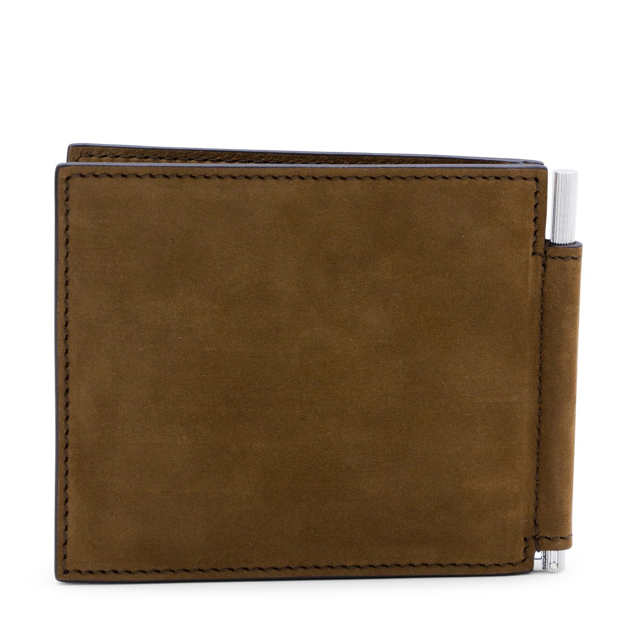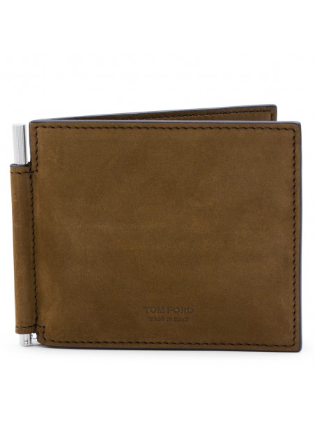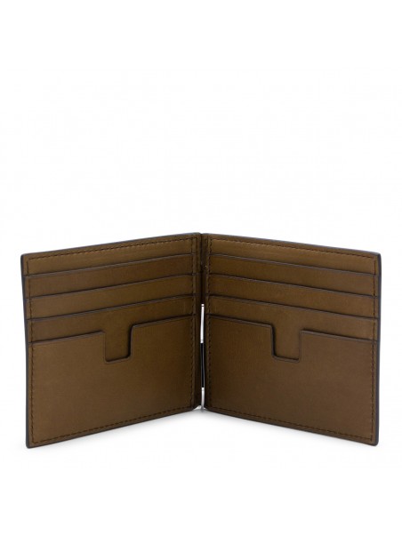 Brown leather wallet from Tom Ford featuring frontal embossed logo, inside pockets and silver tone hardware.