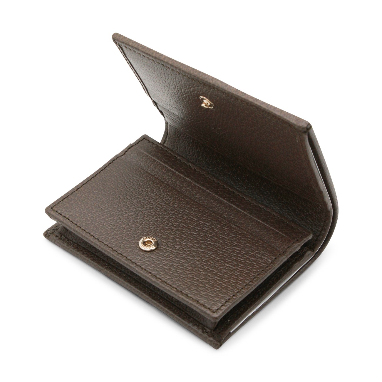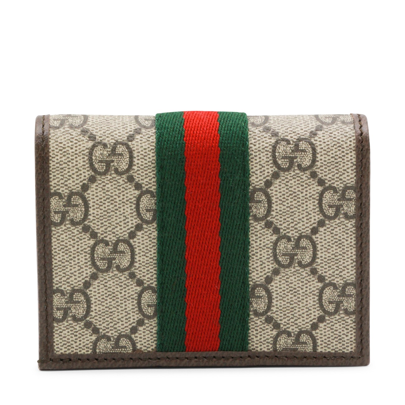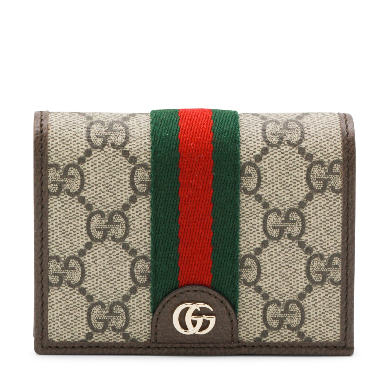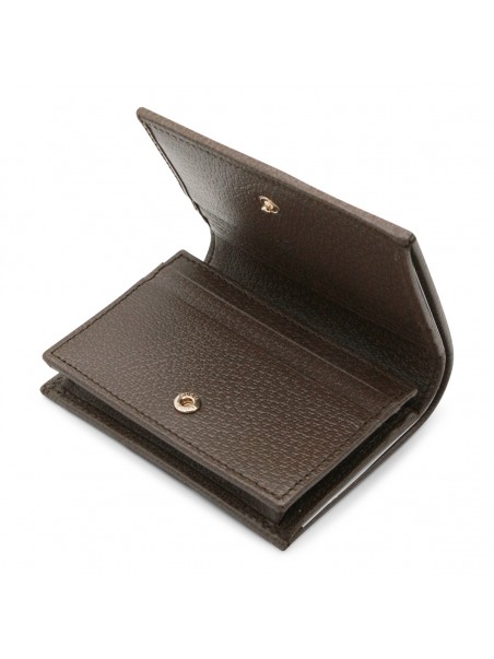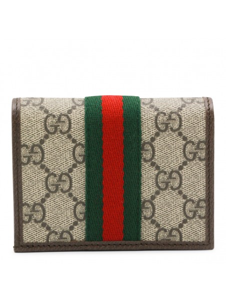 Beige leather wallet from Gucci featuring frontal logo, all over logo pattern and inside pocket and card slots.