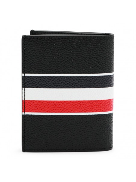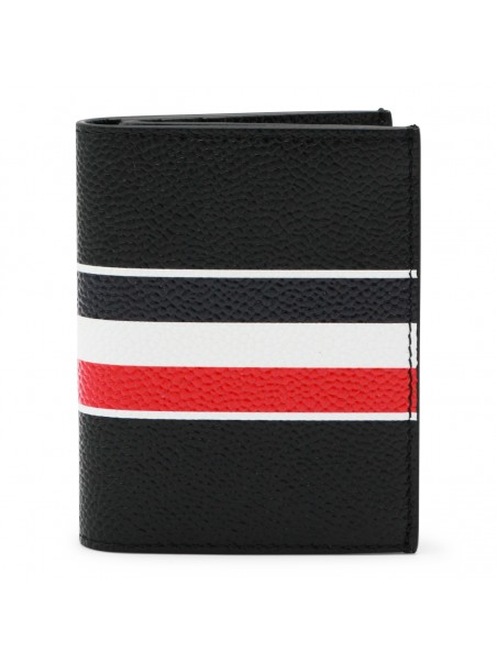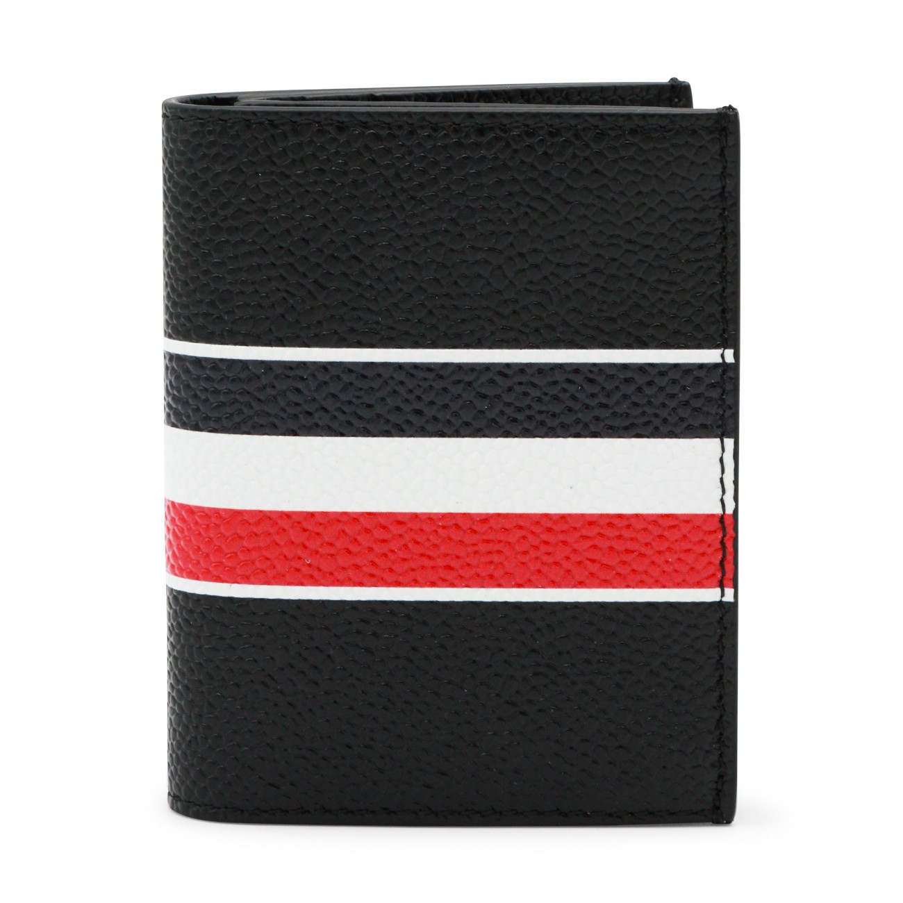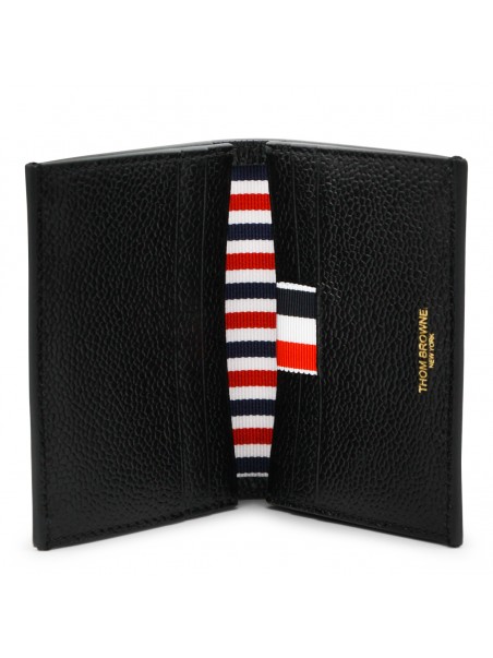 Black card holder from Thom Browne featuring pebble grain leather, Tricolor Stripe band, logo and card slots.