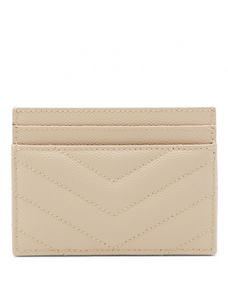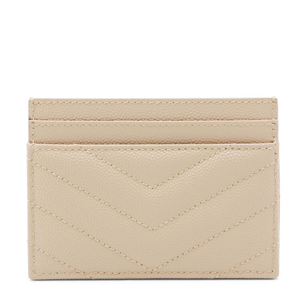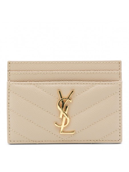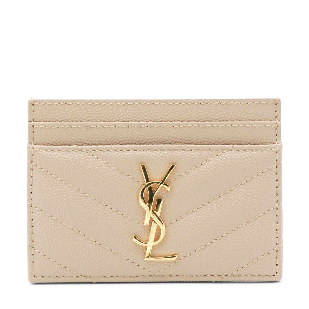 Beige leather card holder from Saint Laurent featuring cards slot and gold tone logo hardware.