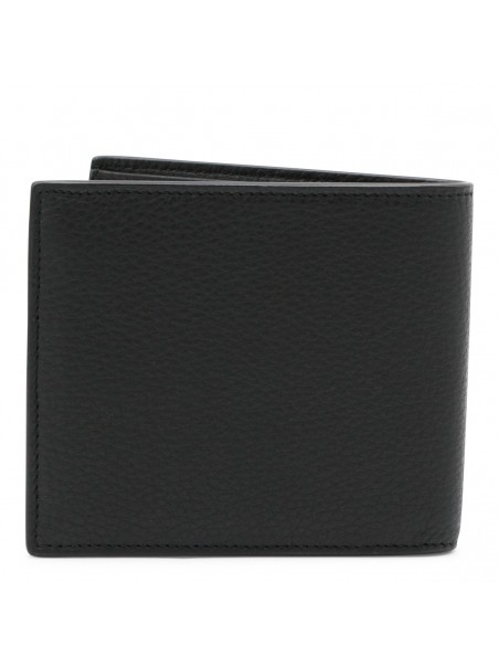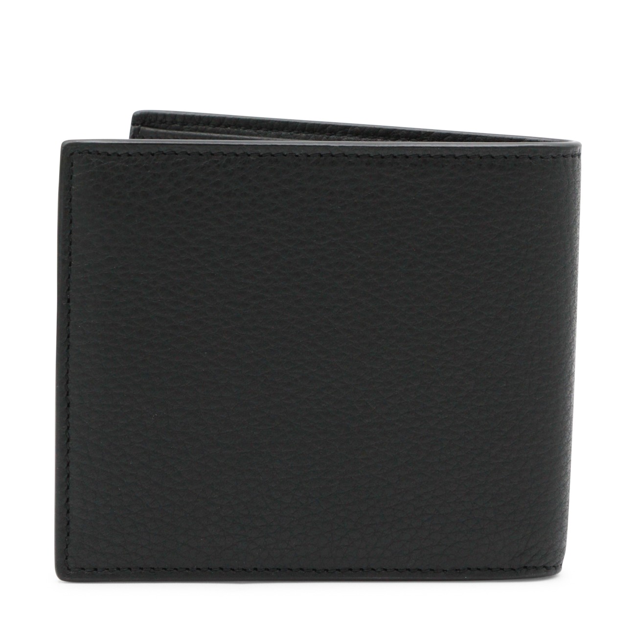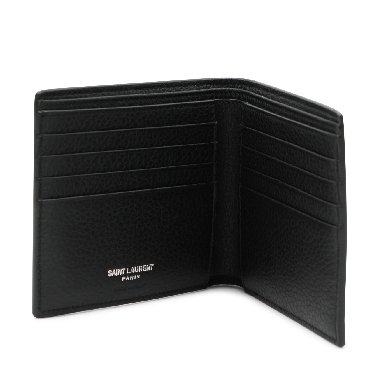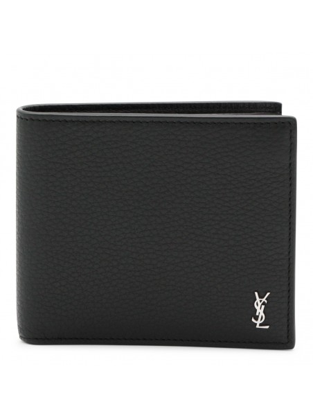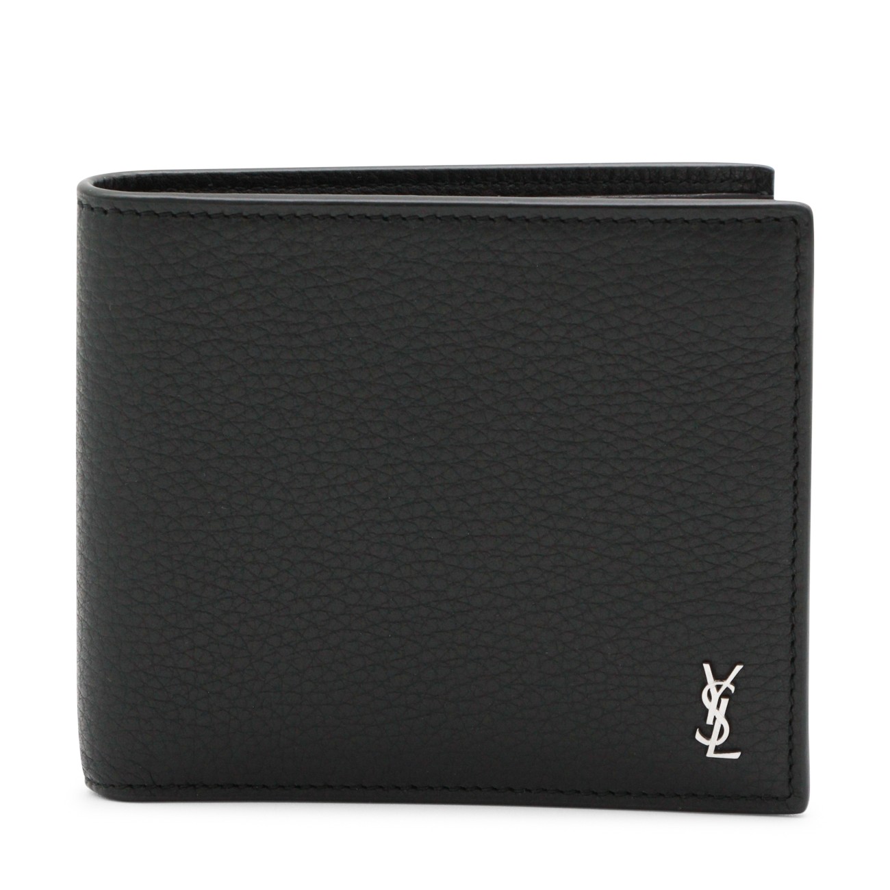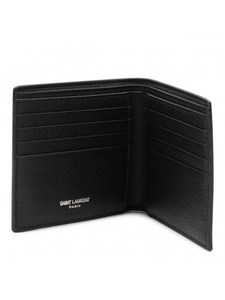 Black leather wallet from Saint Laurent featuring frontal logo, silver tone hardware and inside pocket and card slots.