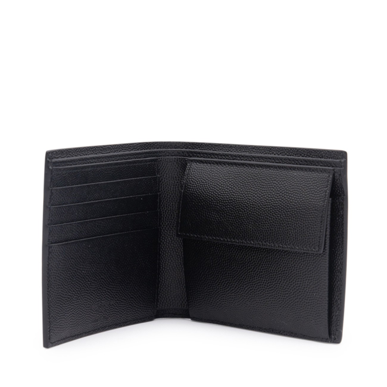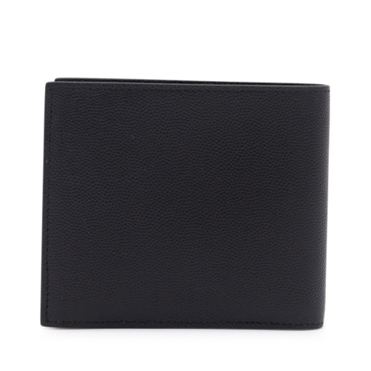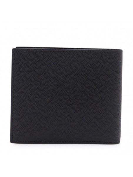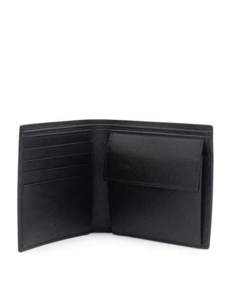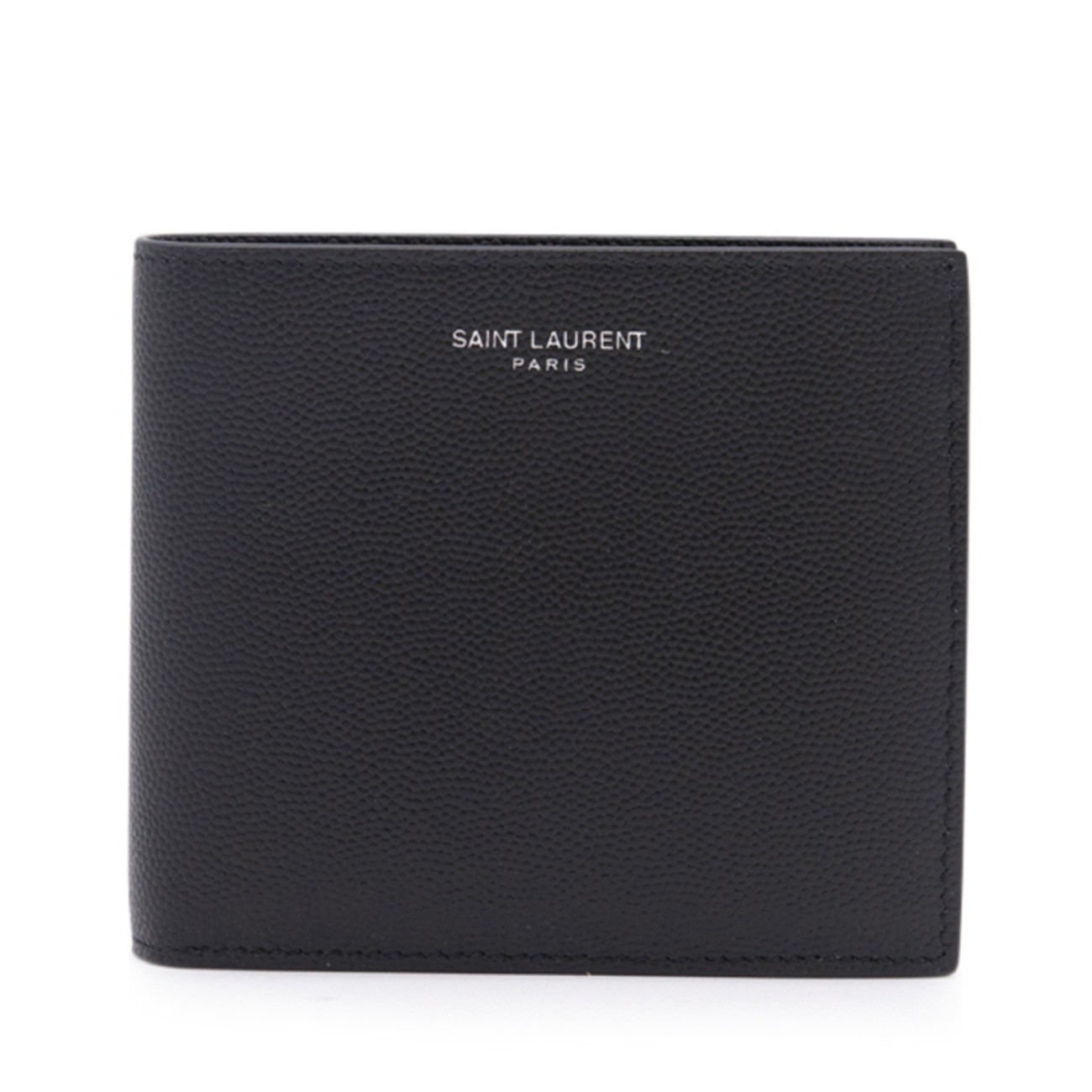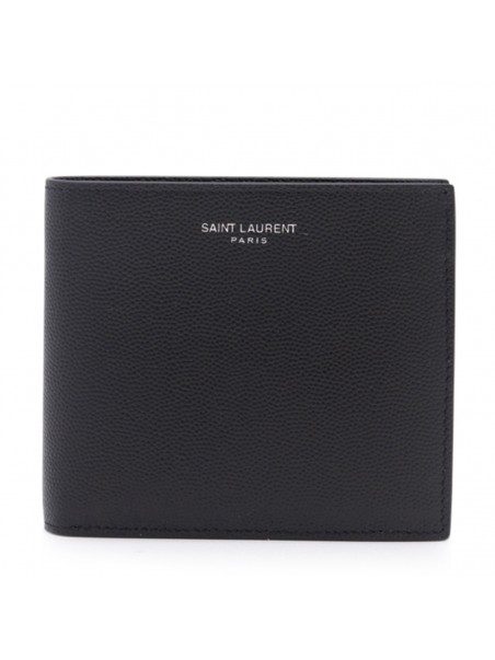 Black leather Paris wallet from Saint Laurent featuring a textured detail, front embossed logo stamp, mutiple interior card slots and coin pocket.